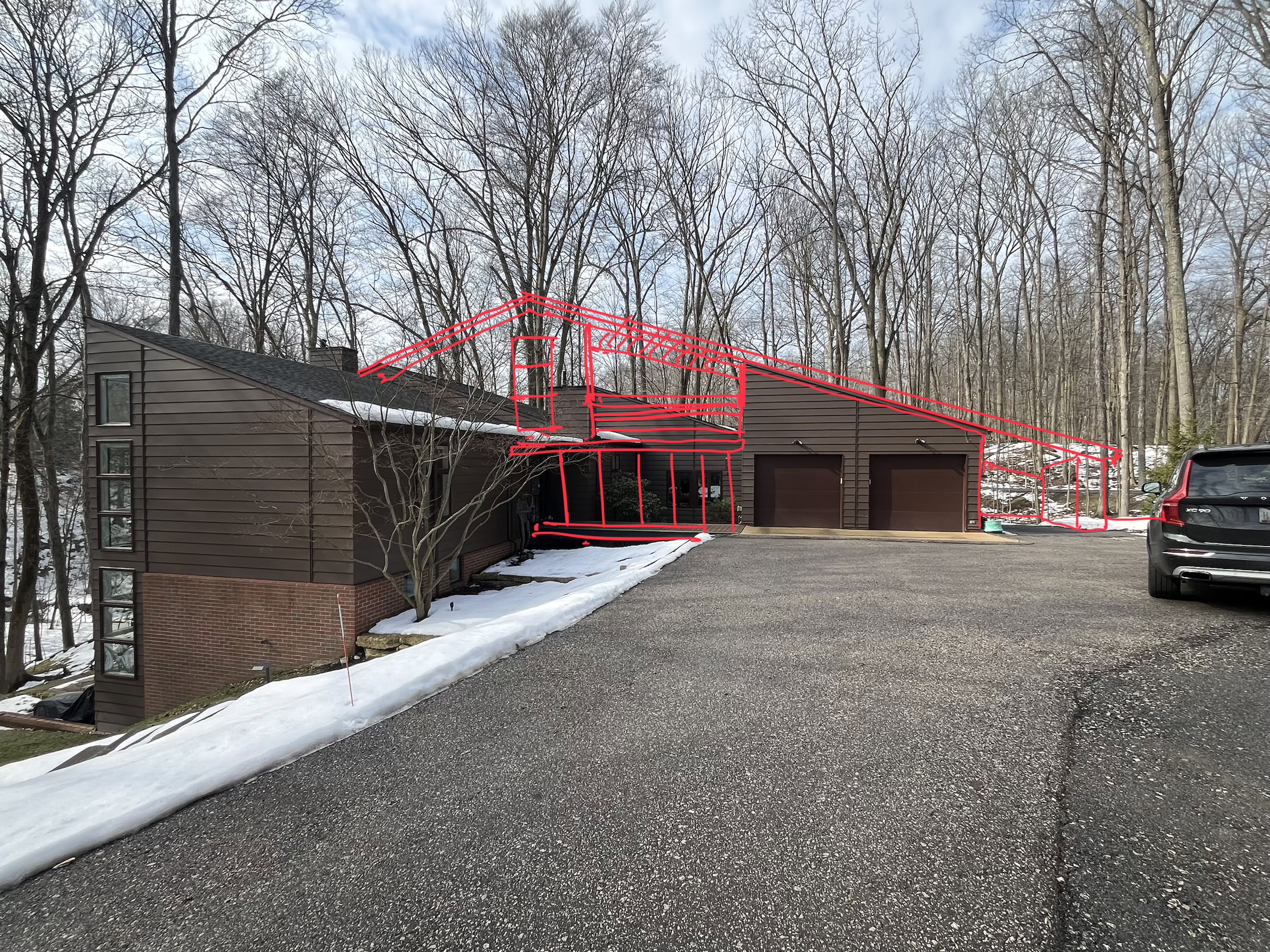enclose a new addition where shown in red new horizontal linear all glass entry carport roof extension to the right shown in red new dark siding everywhere