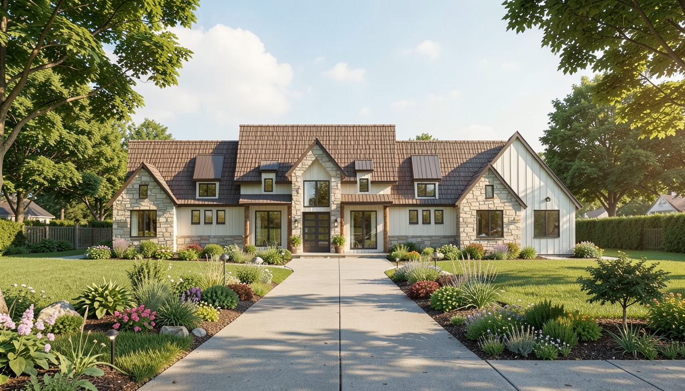 make this photo realistic including the new windows drawn onto it i want the windows to be the same size and format as i ve drawn do not add any grids to the windows add in black light fixtures and make all of the door and window trims black as well remove the weird stucco jet out under the windows leave the retaining wall between the front door and garage