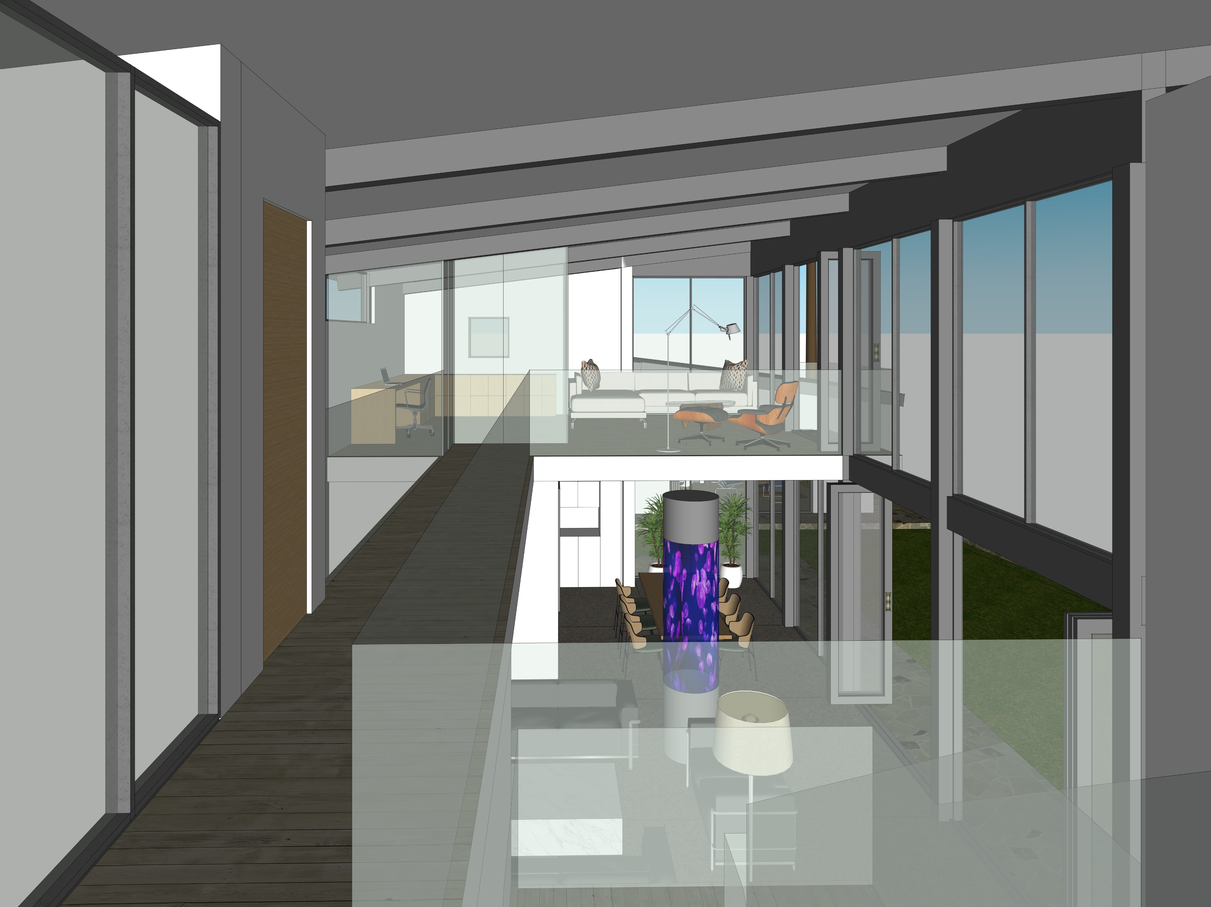 location is pacific palisades california late afternoon sunlight lighting in the space add grass in the yard outside add trees in the adjacent yards outside add a woman sitting on the sofa the glazing mullions are anodized aluminum keep the window at the far end of the source image the glass on the left side of the view is to the outside the purple cylinder at the lower level is an acrylic glass jelly fish aquarium the interior walls are all white plaster add a boy playing with a dog in the yard outside