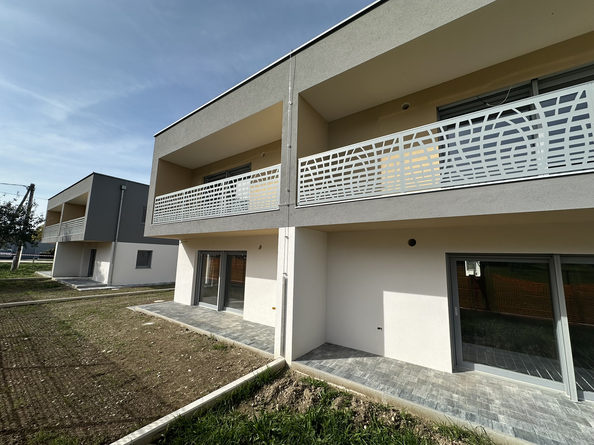 exterior shot summer vibe add trees between the buildings grass architecture