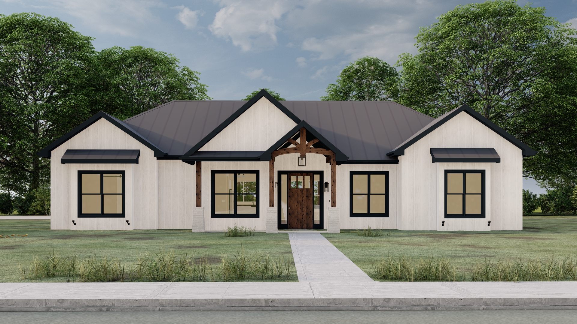 a realistic rendering of a house the lights are on inside the house a landscaped front yard a cloudy but bright sky