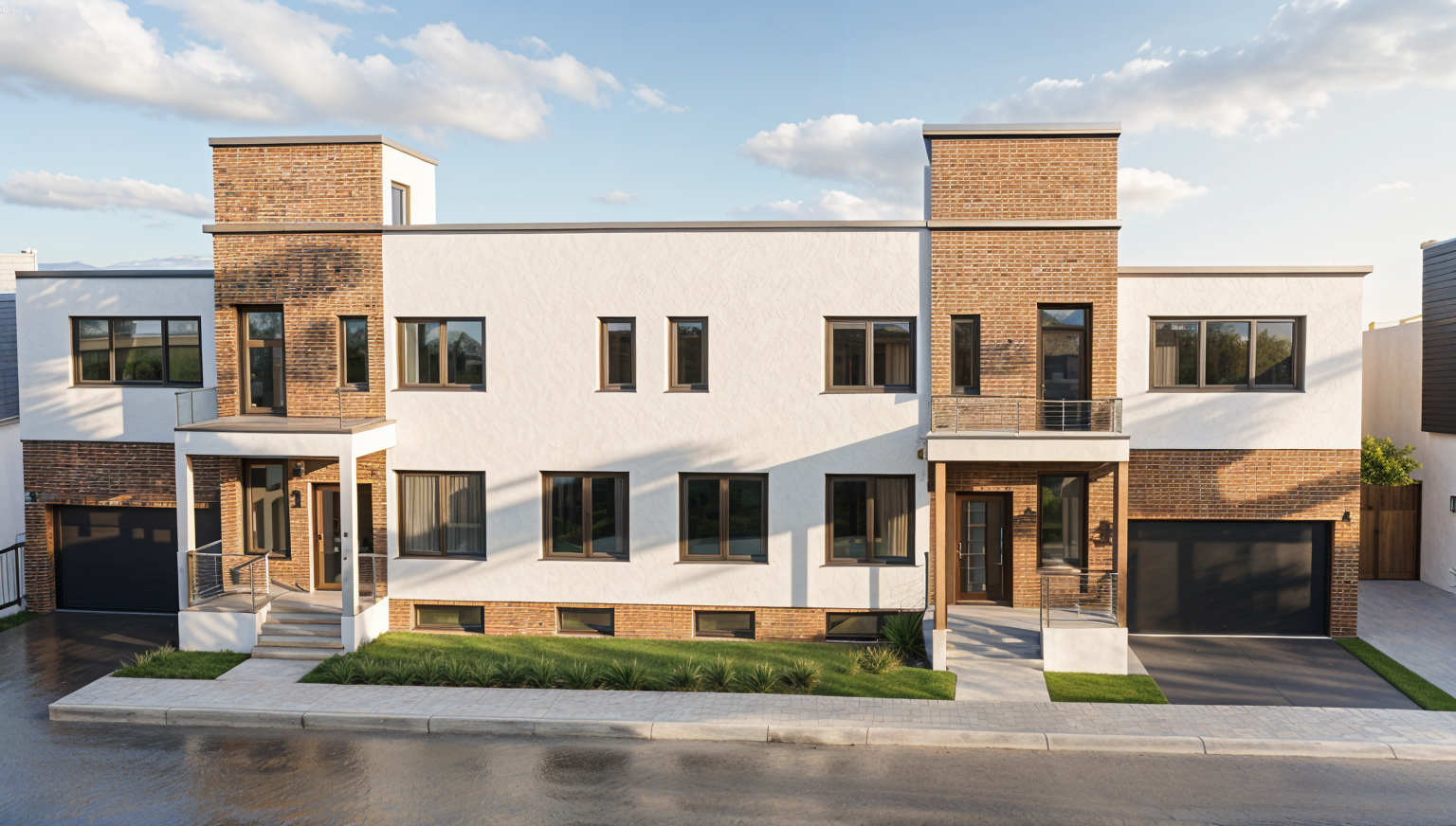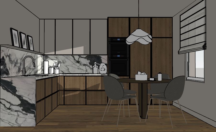 type of image hyper realistic editorial interior photography architectural visualization high end magazine style scene framing interior kitchen dining space based exactly on the provided sketch same camera angle same perspective same proportions and layout eye level view no modifications in geometry or composition kitchen design l shaped kitchen in natural walnut wood medium dark warm tone cabinet doors with subtle vertical relief and integrated carved finger pull u ero tallado all lower cabinets madera no lacquer no mix of materials upper cabinets in light grey matte finish clean smooth with strong visual presence countertop and backsplash in porcelain marble matte finish slightly rough texture natural veining no gloss no reflections no polished look flooring in strip wood alistonado tone walnut cabinetry natural variation matte finish sink and faucet in brushed stainless steel soft reflections appliances styling built in oven column black coffee machine placed between oven and two wooden boards leaning against the wall kitchen props in white porcelain and natural wood dining area round dining table in brushed stainless steel top and base chairs stainless steel legs brushed finish upholstery in dark grey fabric important realistic structure not inflated fabric stretched over internal frame subtle seams and edge definition slight firmness in seat and backrest no soft balloon like appearance table styling critical low cylindrical glass fruit bowl wide diameter low height height 1 3 of diameter open top thin transparent glass no pedestal no vertical shape clearly a fruit bowl not a vase or jar containing pears white porcelain coffee cup small white porcelain milk jug wall shelf styling exactly 3 frames slightly leaning thin black frames minimal neutral soft artwork clean sharp edges lighting natural daylight entering from the right window soft indirect slightly diffused balanced exposure no harsh contrast realistic shadow falloff window off white linen blind semi transparent soft light filtering through fabric lamp pendant lamp made of natural paper cardboard organic shape zara home style warm soft diffused light materials textures walnut wood natural grain matte high realism marble porcelain textured slightly rough no shine stainless steel brushed soft reflections fabrics matte tactile realistic tension color palette warm walnut light grey off white stainless steel dark grey accents elegant calm contemporary atmosphere refined warm minimalism subtle natural haze very light turbidity for realism editorial not over stylized quality ultra realistic high detail 8k global illumination physically accurate materials restrictions very important do not change layout proportions or camera do not move objects do not add new elements do not reinterpret design no glossy marble no plastic looking materials no inflated furniture fruit bowl must not become a vase