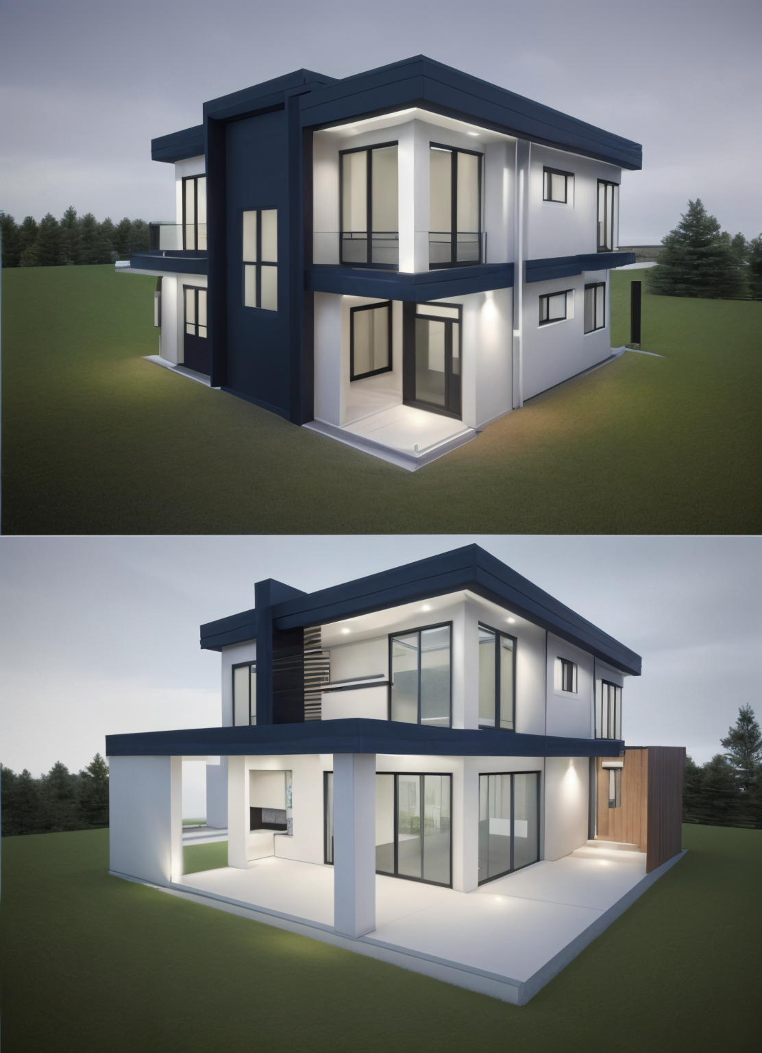 minimalism exterior shot modern two story house with sleek architectural design white walls and black accents large glass windows reflecting sunlight surroundings feature lush green landscaping with colorful flowers bright blue sky with soft fluffy clouds atmosphere tranquil and inviting color palette white black gray deep green vibrant floral colors light blue architecture