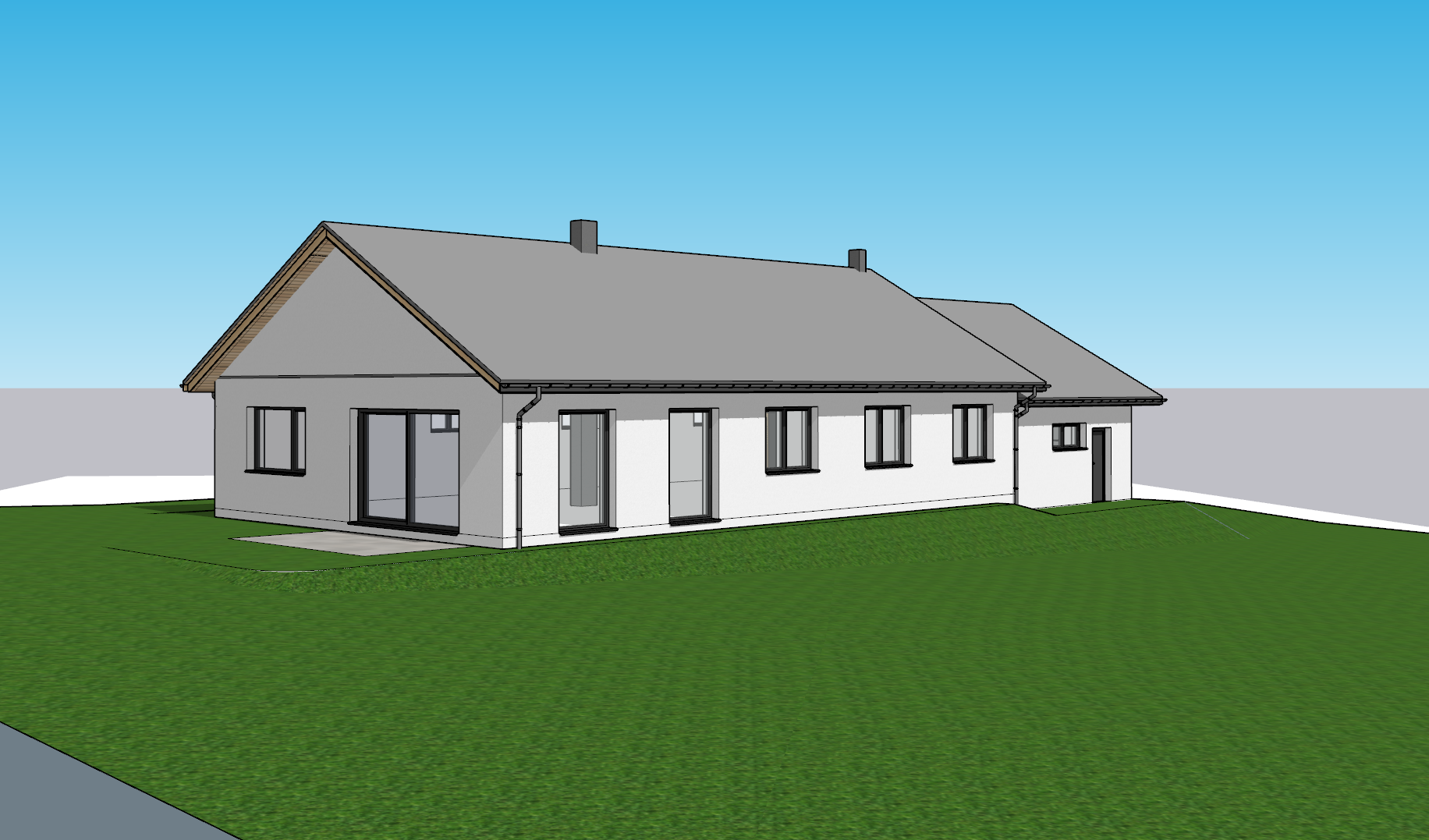 a flat grey roof tile laid in a staggered pattern white plaster on the walls a thin grey horizontal strip on the gable wall anthracite coloured window and door joinery a chimney covered with grey seam sheet metal low bushes around the house a sunny sky a light wood soffit lamps in the soffit curtains on the windows children playing a paved terrace a garden sofa and a barbecue on the terrace