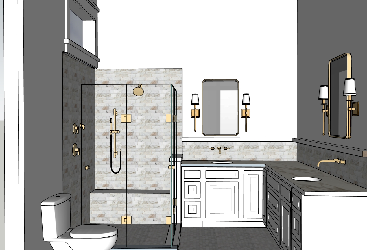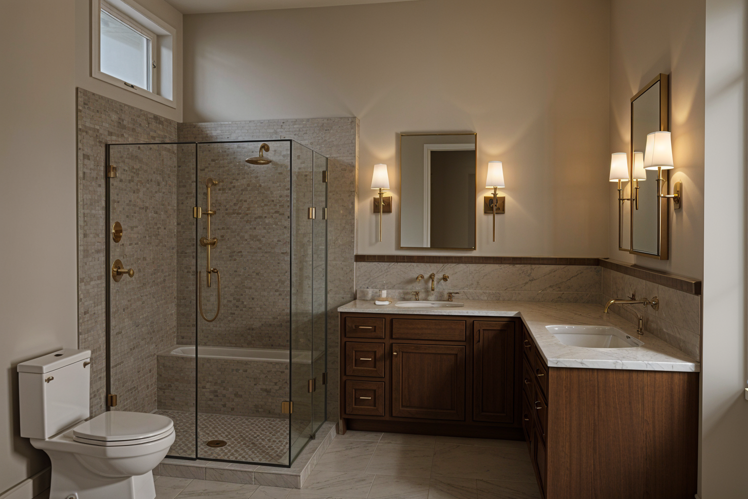 warm lighting marble mosaic floors and backsplash marble subway tile on shower walls