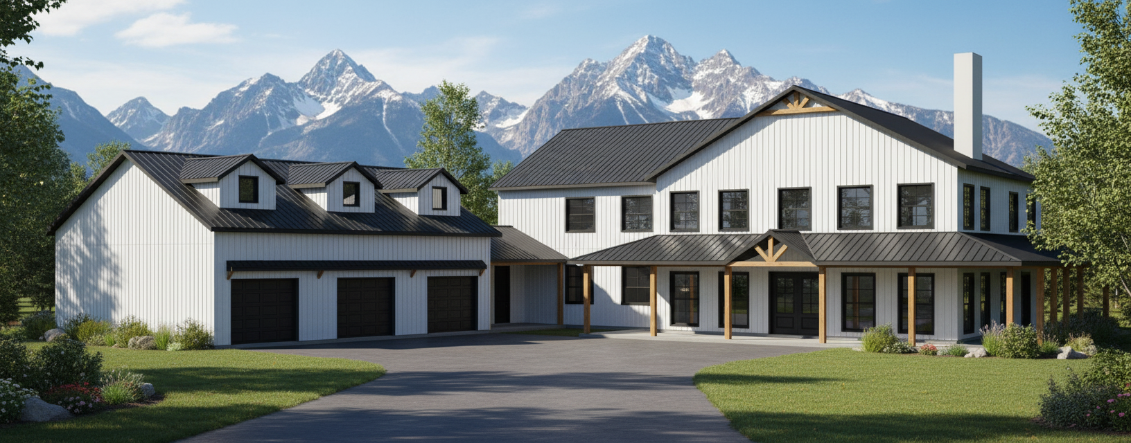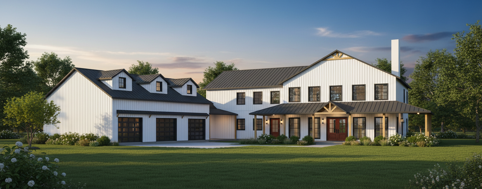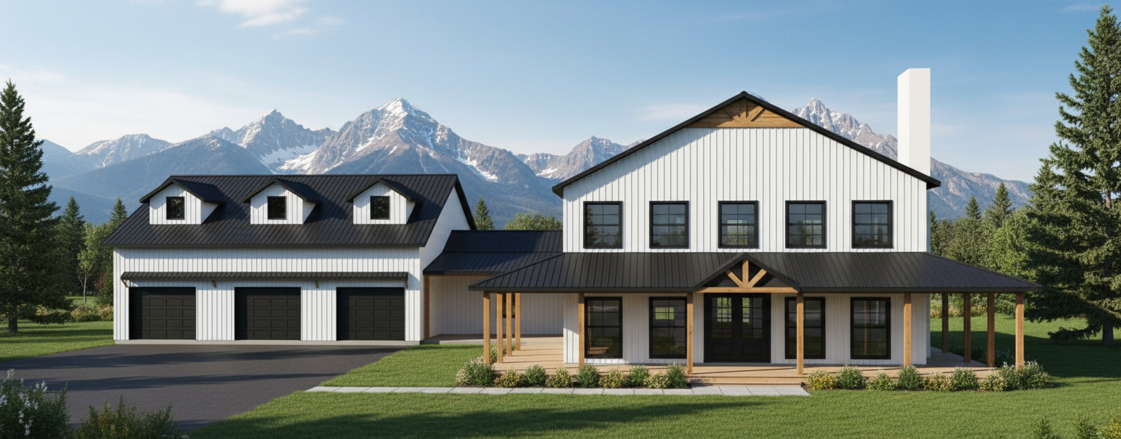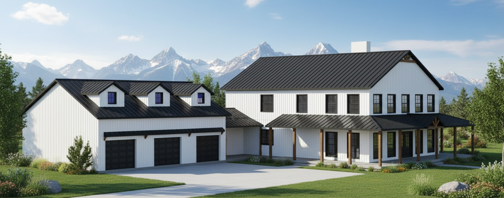 modernist exterior shot create a realistic picturesque rendering of a modern farmhouse design the house features a large two story structure with a metal roof painted in sleek charcoal grey the exterior walls are clad in vertical metal siding showcased in bright white for a clean contemporary appearance the windows are traditional style framed in black for striking contrast the front entrance boasts elegant double doors in rich mahogany wood adding warmth and sophistication the atmosphere is one of a sunny afternoon with a clear blue sky casting soft natural light over the scene the garage doors are glass paneled surrounded by white frames enhancing the modern aesthetic lush green landscaping surrounds the house creating a welcoming and tranquil setting architecture
