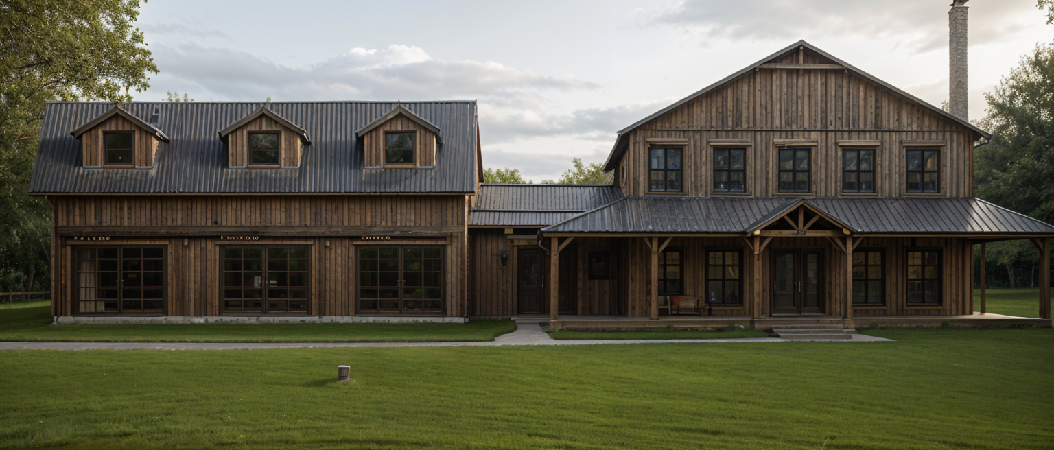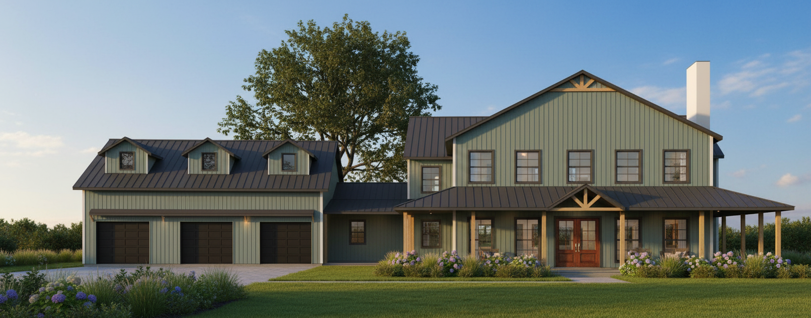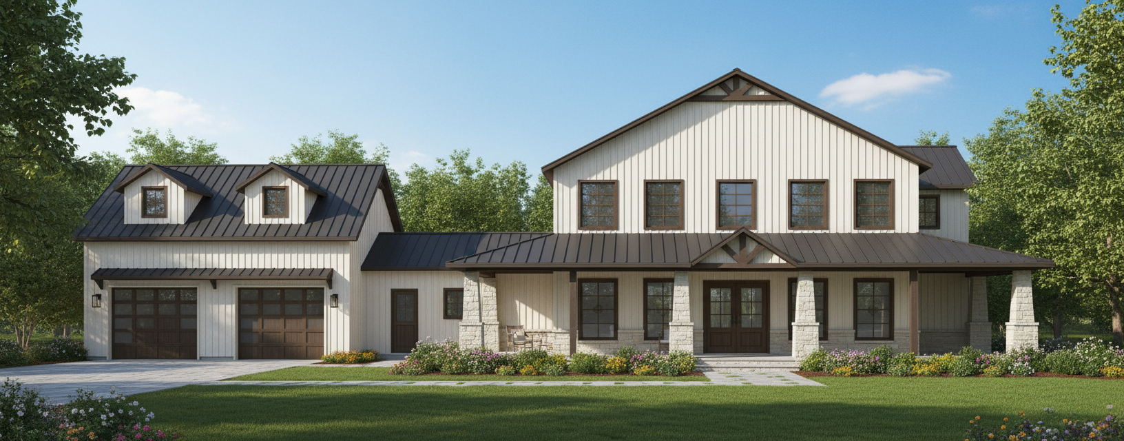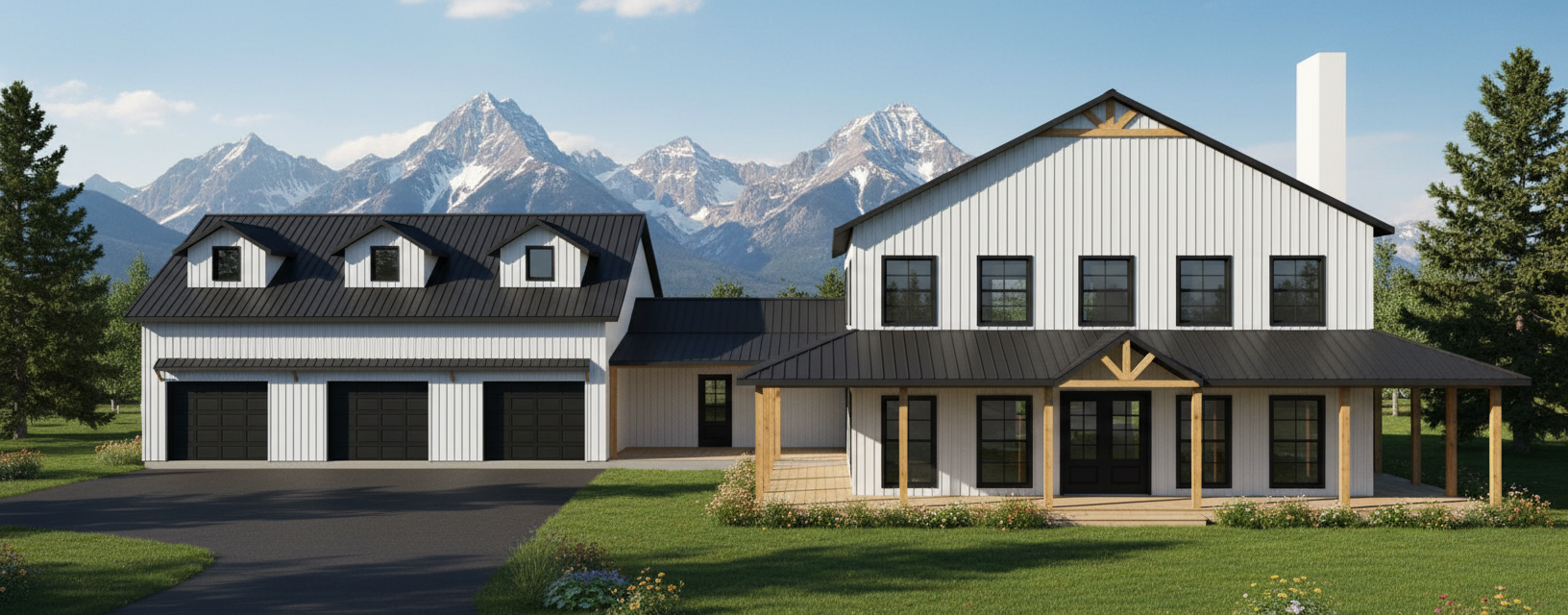modernist exterior shot create a realistic picturesque rendering of a modern farmhouse design the house features a large two story structure with a metal roof painted in sleek charcoal grey the exterior walls are clad in vertical metal siding showcased in bright white for a clean contemporary appearance the windows are traditional style framed in black for striking contrast the front entrance boasts elegant double doors in rich mahogany wood adding warmth and sophistication the atmosphere is one of a sunny afternoon with a clear blue sky casting soft natural light over the scene the garage doors are glass paneled surrounded by white frames enhancing the modern aesthetic lush green landscaping surrounds the house creating a welcoming and tranquil setting architecture