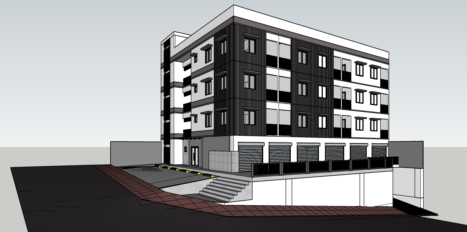 modernist exterior shot render a 4 storey box modern mixed use building located on a corner lot in an urban subdivision the architectural style is clean and boxy with a neutral color palette the facade features wpc wood plastic composite panels large glass windows and steel balcony railings on the upper residential floors each floor contains 8 residential units each with compact balconies the first floor has no active commercial use yet closed roll up doors are in place to suggest future storefronts the entrance area is marked by a stone cladded wall and subtle lighting the scene is set during sunset with a warm golden glow casting soft shadows on the building s facade the camera angle is at street level from the corner of the lot showing both street facing sides include a few people walking along the sidewalks some pausing to look at the commercial area creating a sense of liveliness and urban transition include street elements such as curbs light poles minimal greenery like tree planters or shrubs and concrete pavement to reflect the subdivision setting keep the overall mood calm and contemporary with soft ambient lighting and realistic textures architecture