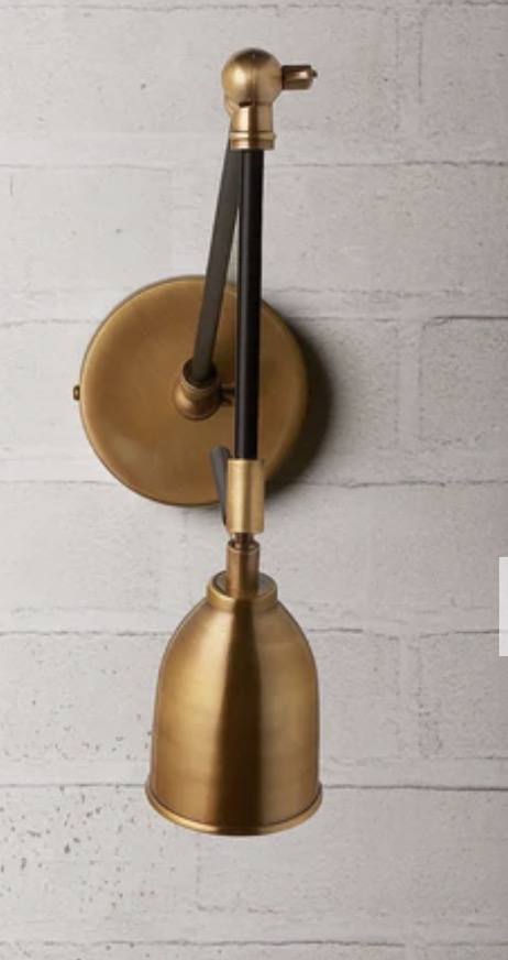 bronze wall mounted lamp with an industrial design featuring smooth warm golden tones and a matte black arm the background is a textured light gray brick wall adding a vintage charm the atmosphere is cozy and elegant bathed in warm ambient lighting that enhances the metallic luster of the lamp