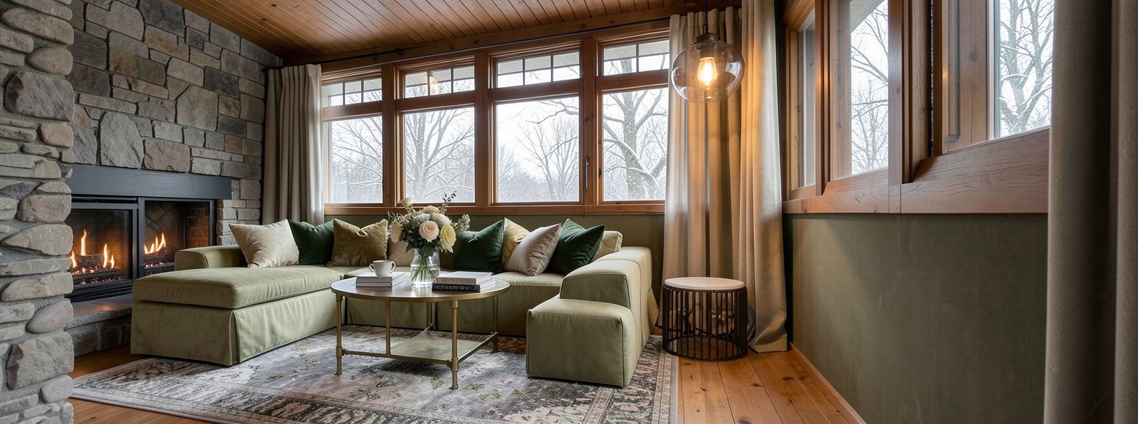 archsynth generation input image a charming suburban ranch style house with a welcoming atmosphere the exterior is painted in a soft cream color with a contrast of dark brown trimmings the roof is a warm terracotta the front door is a rich mahogany color surrounded by a cozy porch with rustic wooden beams the garage doors are crafted from natural wood with black metal hardware the driveway is paved in light gray cobblestone the landscape is lush with green grass dotted with colorful flower beds featuring vibrant reds yellows and purples the sky above is clear blue with soft fluffy white clouds the lighting is warm and golden suggesting a peaceful late afternoon setting