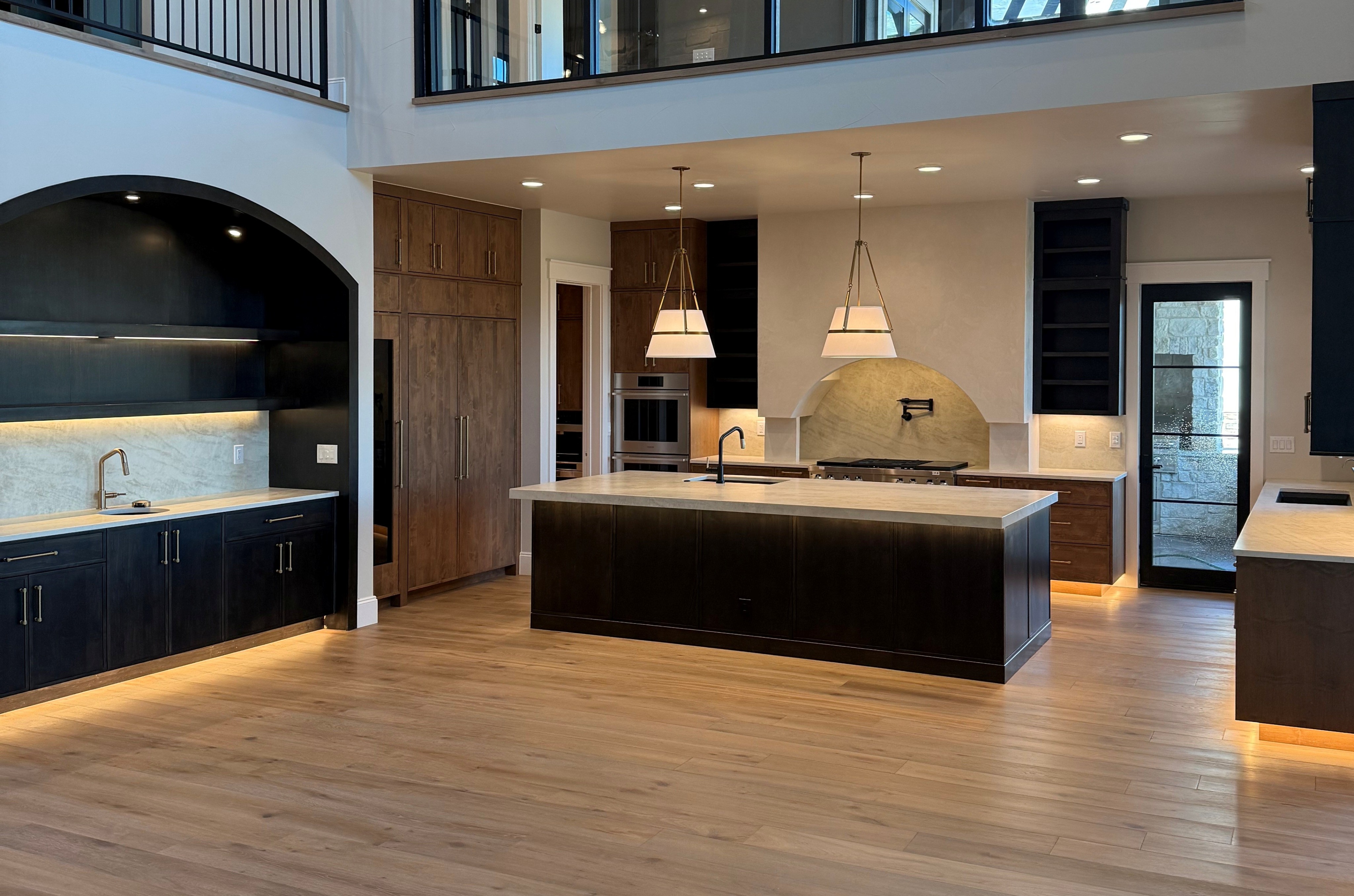 do not change the cabinets in any way preserve the exact cabinet colors materials finishes dimensions door and drawer styles hardware spacing alignment and all geometry exactly as shown do not alter the countertop shape backsplash appliances flooring lighting fixtures or wall structure only remove the construction materials clutter and mess from the scene clean the room and make it look finished and staged add a few simple tasteful home accessories appropriate for the style of the space but do not add or remove any furniture windows or architectural elements maintain the original lighting direction and realism enhance clarity and polish the photo while keeping the cabinetry and room design completely unchanged do not alter the lighting to keep the cabinet colors as they are in the image stage the countertop for a kitchen stage the cabinets and shelves under the arch for a wet bar add stools to the island add a casual seating area