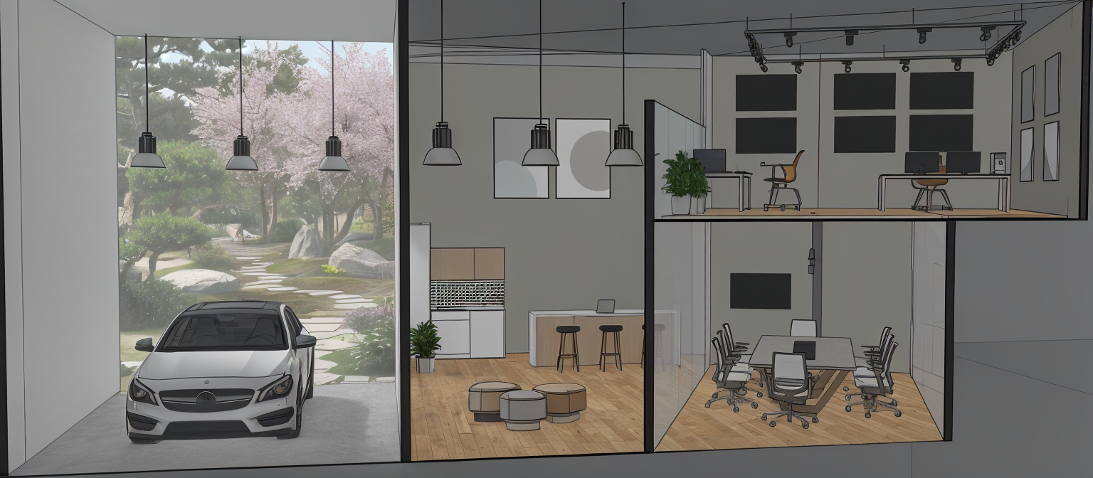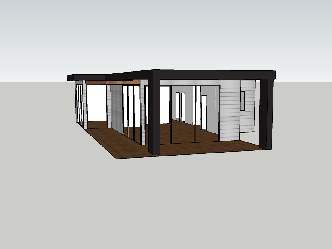 exterior shot render a modern rectangular building with large glass windows surrounded by a serene minimalist environment the structure features a dark charcoal grey flat roof and trim with wooden siding walls in a soft white textured finish the interior visible through the glass has rich dark wooden floors enhancing the modern aesthetic the ambient atmosphere is calm and peaceful with a clear light grey sky use soft natural lighting to highlight the sleek and sophisticated design