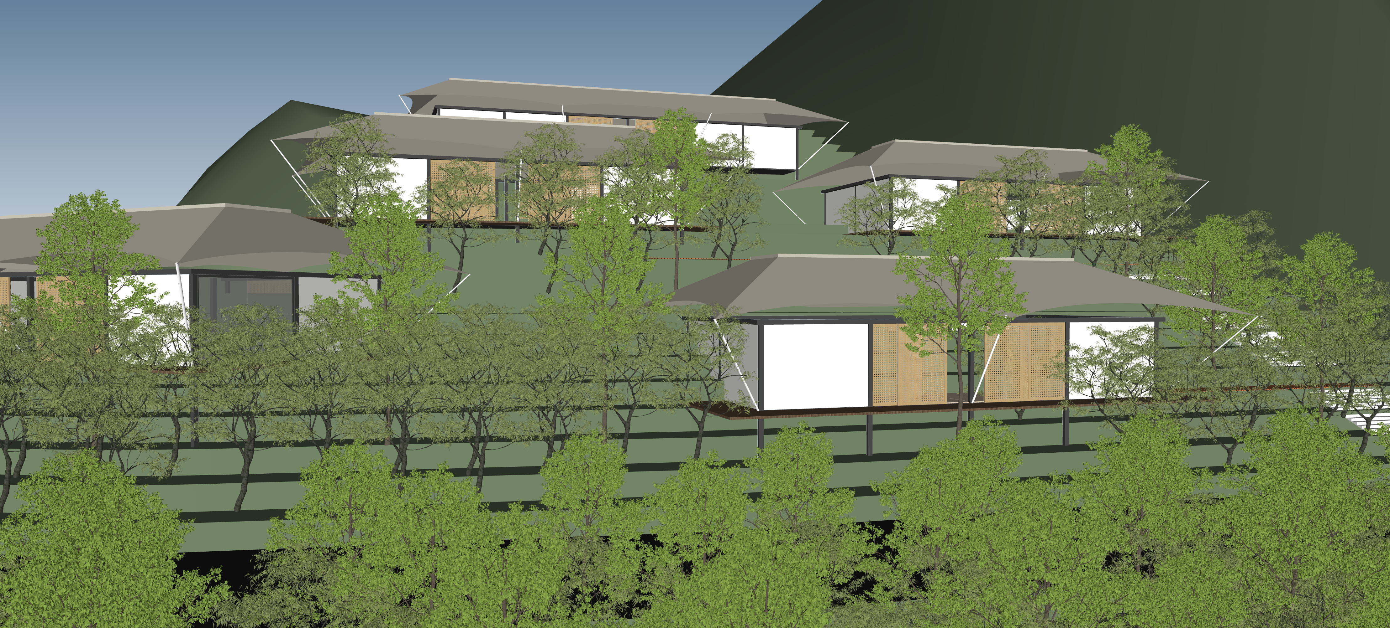 archsynth render improvement using the same angle and unmodified 3d geometry reinterpret the building as a luxury sleeping cabin with a light brown tent roof and warm natural materials enhance window frames fa ade texture and the intimate cabin character preserve the existing structural elements and arrangement add rich tropical forest vegetation behind the cabin to strengthen the labuan bajo hillside atmosphere