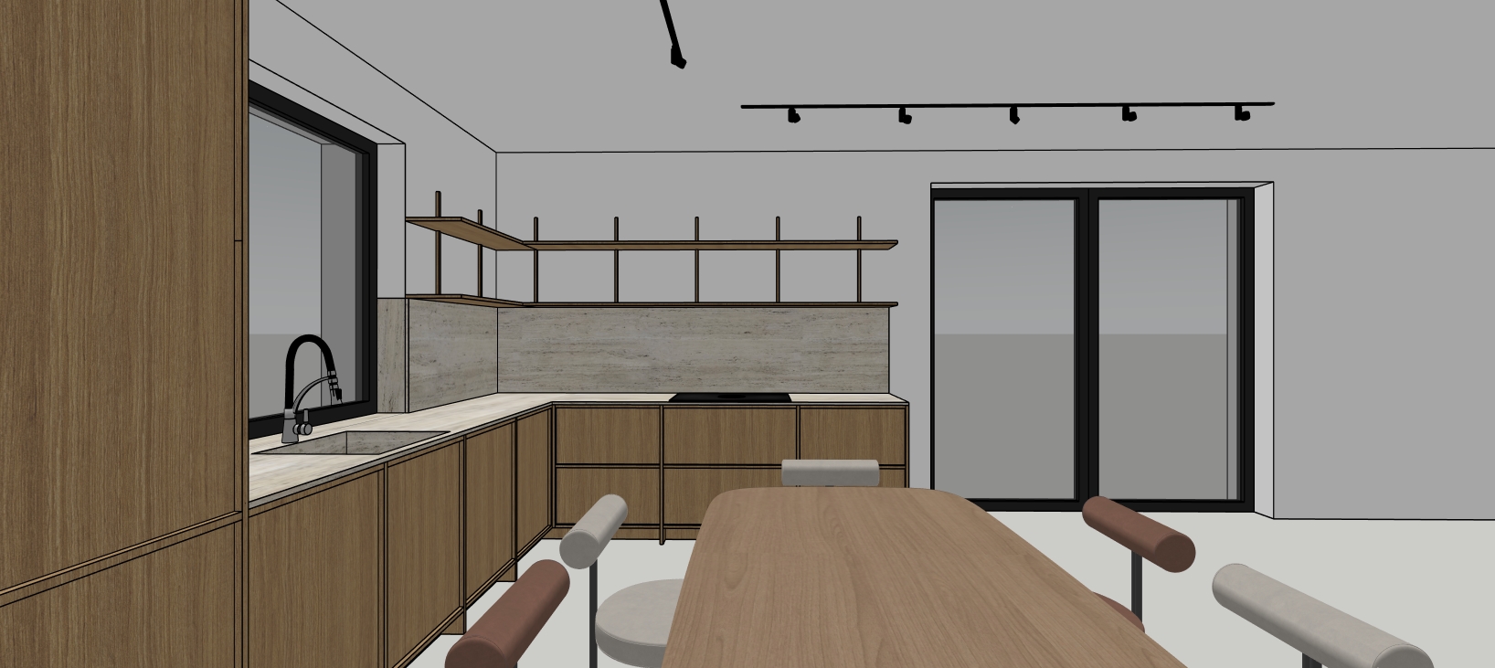 render this kitchen with natural day light add decorations on the shelfs add trees in the windows maintain the exact materials just add the natural light add soft stzlish curtains on the dooble window doors