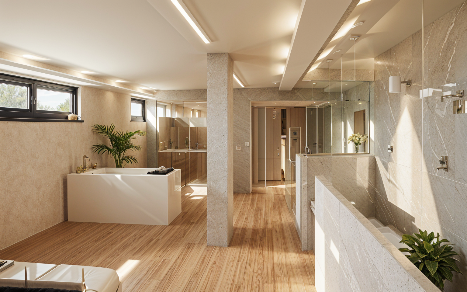 add short uniform grass in the green areas improve the matt wooden planks of the swimming pool area but keeping the color quite uniform put some light nice clouds in the sky make the perimeter of the swimming poll in a light grey beige