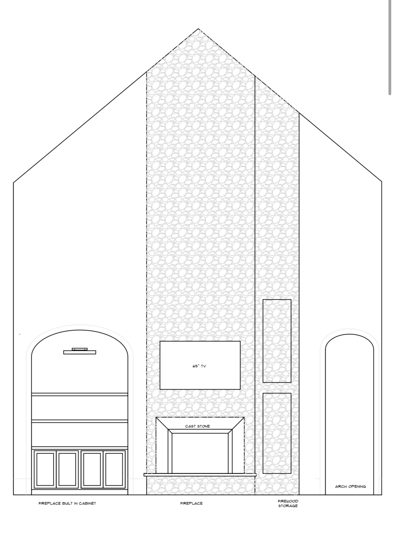 this is a grand living room with a cathedral ceiling comprised of stained tongue and groove wood the fireplace is made of german schemer limestone and cast stone there are wooden built in shelves and cabinets to the left of the fire place there is firewood storage to the right of the fire place the arched opening leads into a hallway perpendicular to the living room there are two simple brass chandeliers in the living room