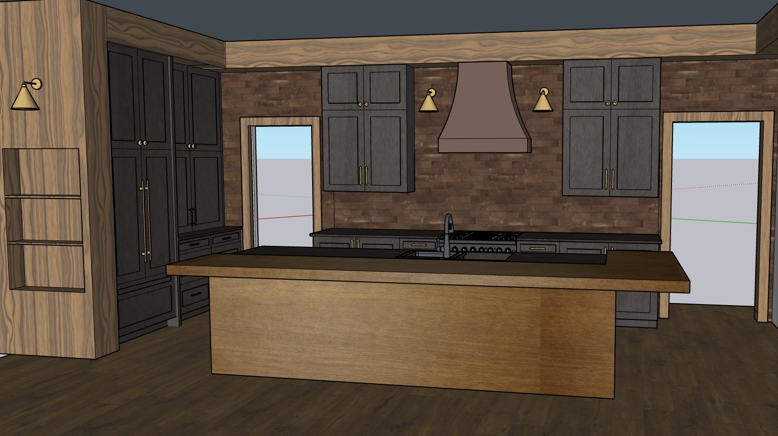 photorealistic interior kitchen render maintain exact layout proportions and colors from the model do not redesign make realistic shadows nothing too bright but just natural cabinetry dark charcoal shaker cabinets with wood graining showing through along with warm brass hardware island warm medium walnut wood with a darker stained wood countertop upper beam shelving wall natural walnut wood with visible grain countertops matte black stone countertop on base cabinets and island brick rustico nero brown 3x12 matte porcelain brick look tile range hood brushed aged copper metal hood soft patina not shiny warm tone faucet hardware brushed brass finish doorway this is a pocket door opening no swing door visible range wall sconces warm brass sconces with soft warm light lighting warm natural daylight soft interior lighting realistic shadows style high end custom kitchen realistic materials pbr textures soft reflections keep cabinet colors wood tones and layout exactly as modeled make render look like real life but not change design doorways important both side doorways should lead into small adjacent rooms not blank or exterior space these rooms should feel cohesive with the kitchen by using coordinating warm earthy tones no bright white or stark contrast pull colors from the kitchen palette warm wood tones soft browns muted neutrals so the transition feels natural and intentional the left perimeter cabinets need to be visible