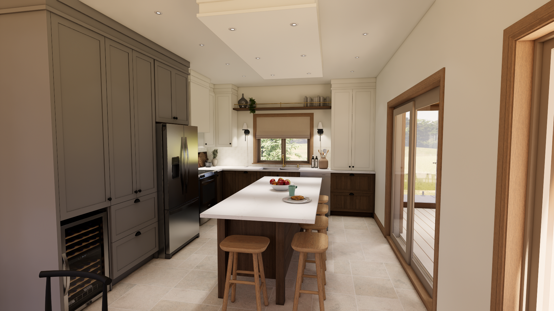 colonial revival interior shot cabinetry use warm natural wood with visible grain but in a lighter medium tone not too dark doors should be flat or plain wood not shaker with long elegant handles black or brass island make it feel like a furniture piece in natural wood with a stone or granite countertop with movement and character but in lighter shades beige cream soft grey veins lighting add 2 3 statement pendant lights above the island glass bronze brass artisanal and elegant reduce ceiling recessed lights so pendants become the focal point backsplash textured stone or handcrafted ceramic with warmth avoiding too much uniformity floor natural stone or wood in medium warm tones not too dark atmosphere bright cozy timeless rustic elegance avoid heavy wood crown moldings and overly dark finishes architecture