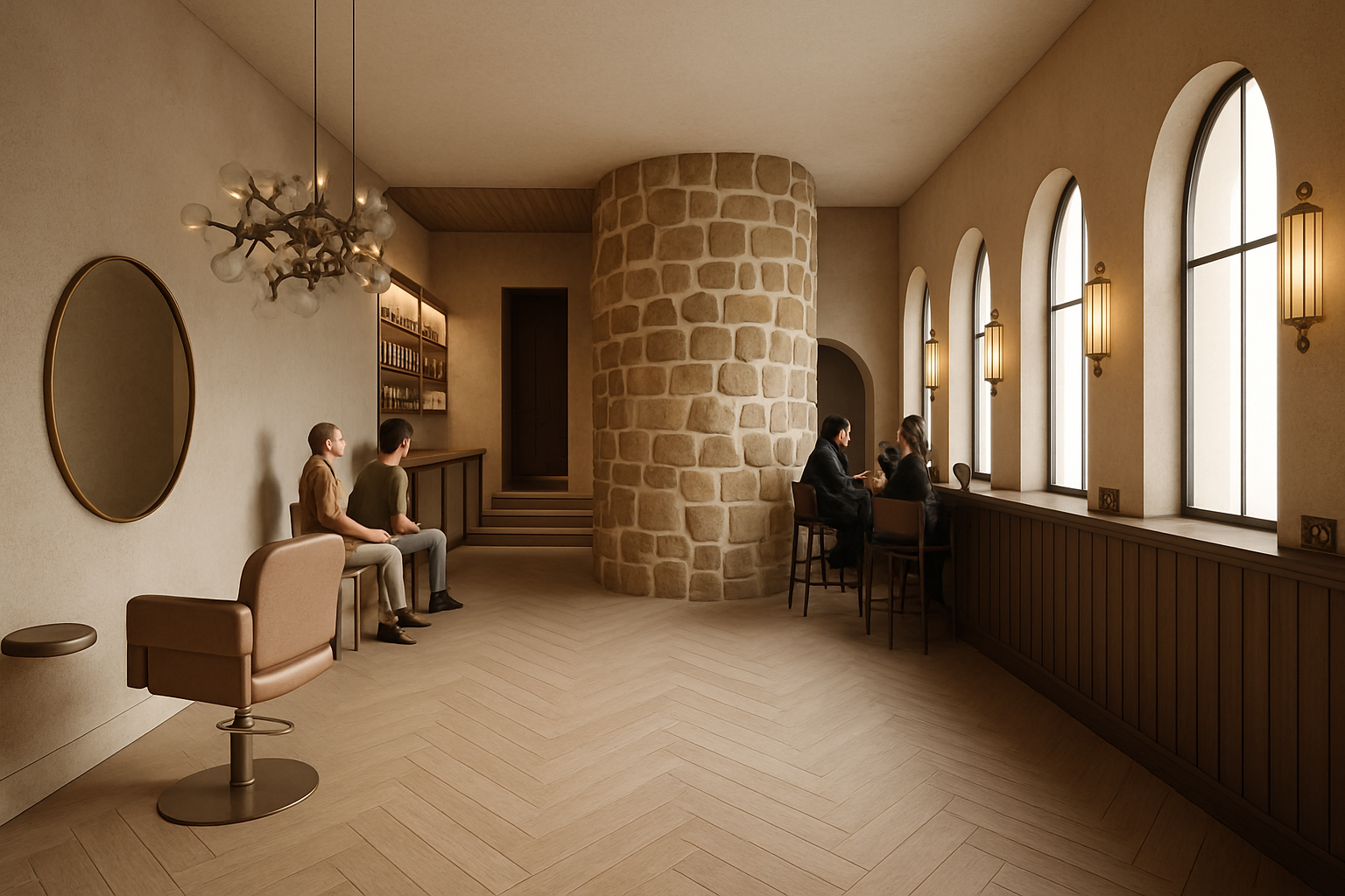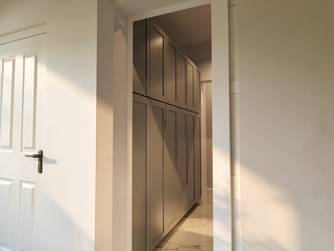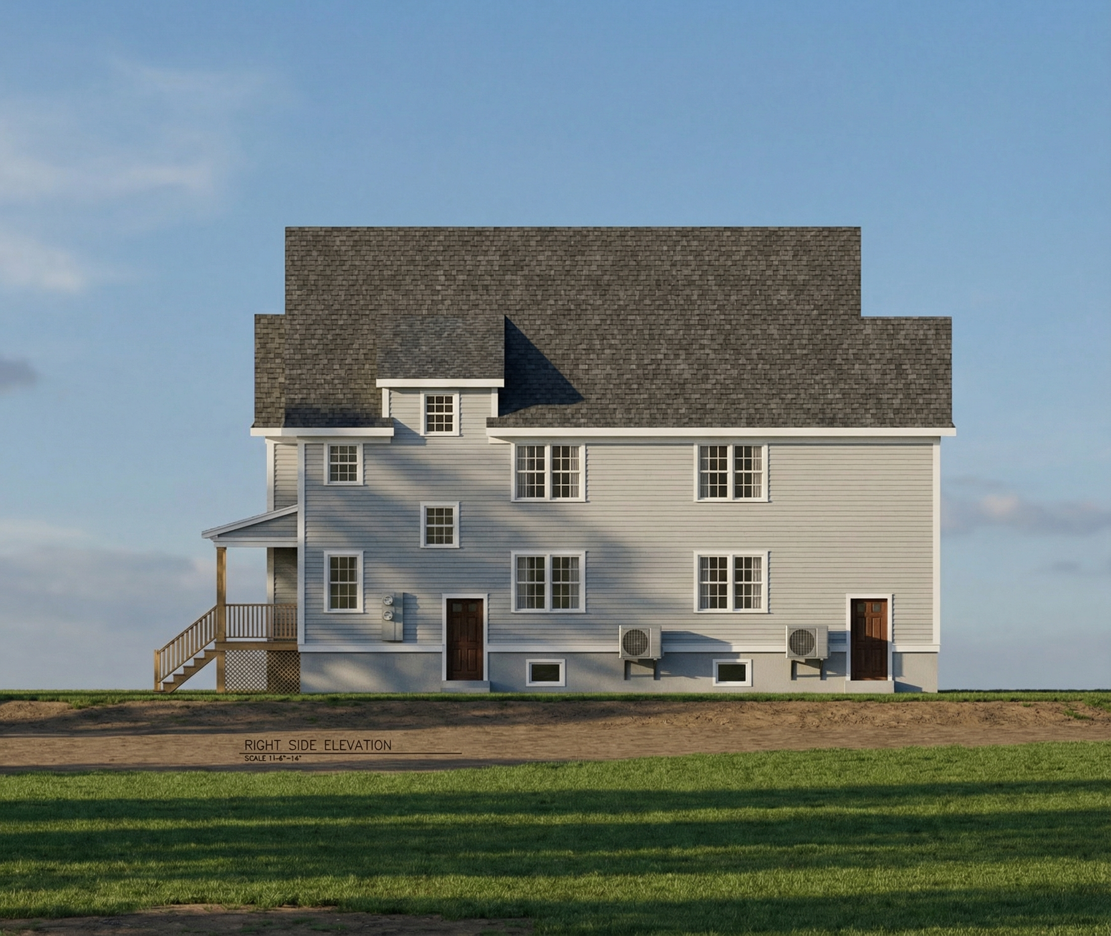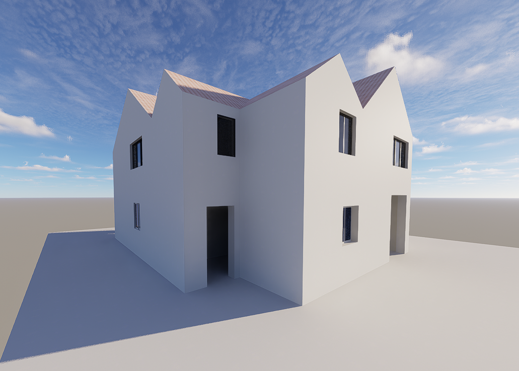 make this a nice external shot with complete doors and windows make the walls white render and the rood a dark brown slate make the sky natural and add trees and a path to the front door