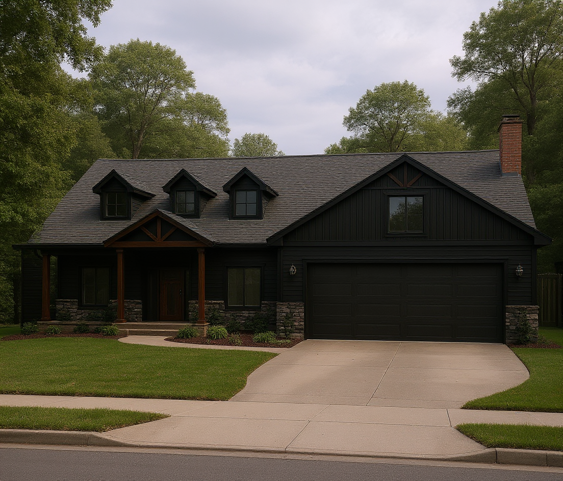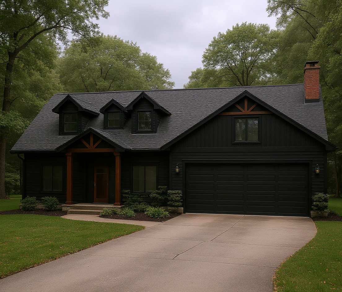 black siding windows shingles solid garage door stained columns and gable accents