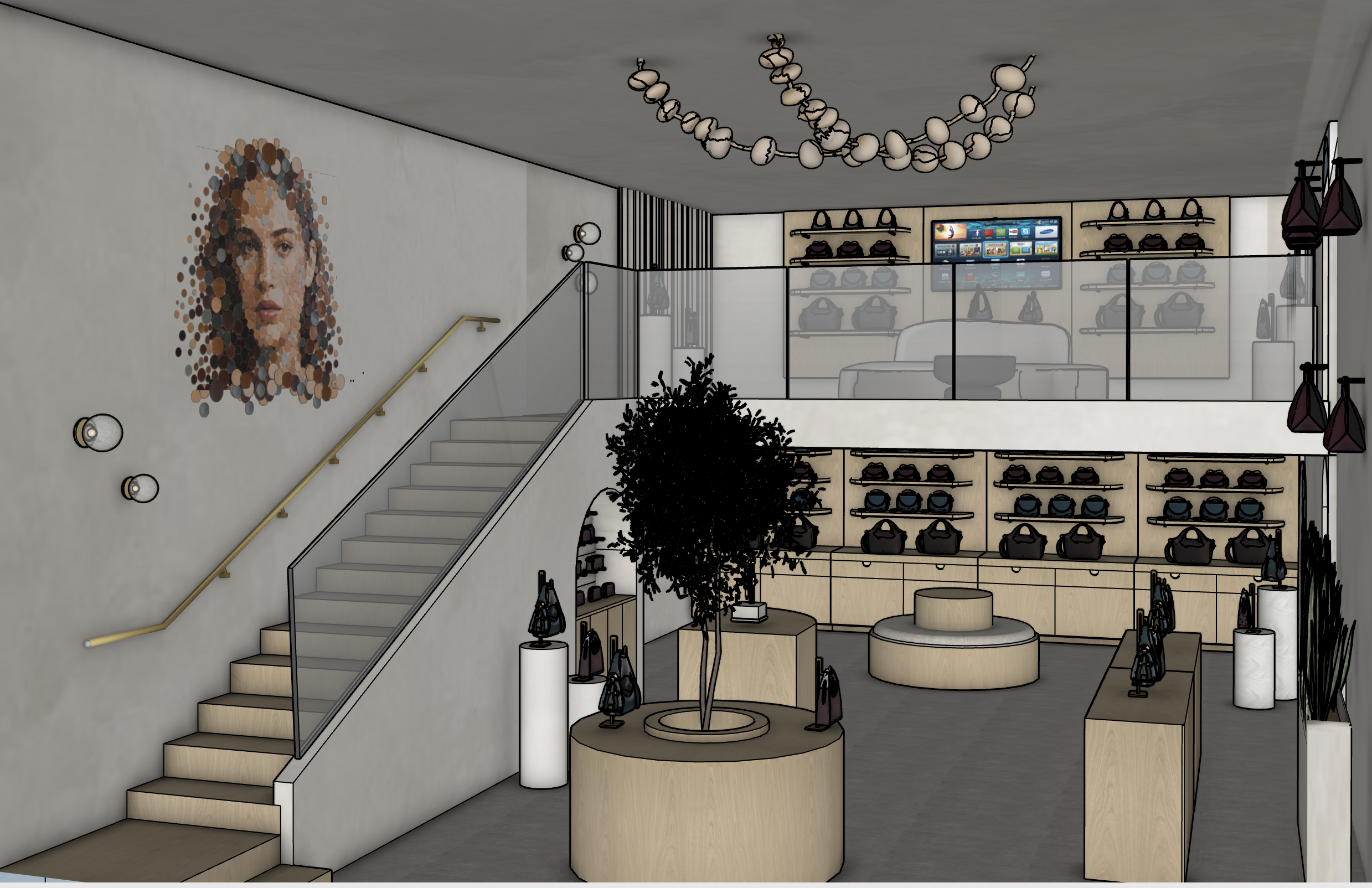 make photorealistc add lighting to the chandelier and scones add 20 recessed lights to the ceiling add back lighting to the bag display