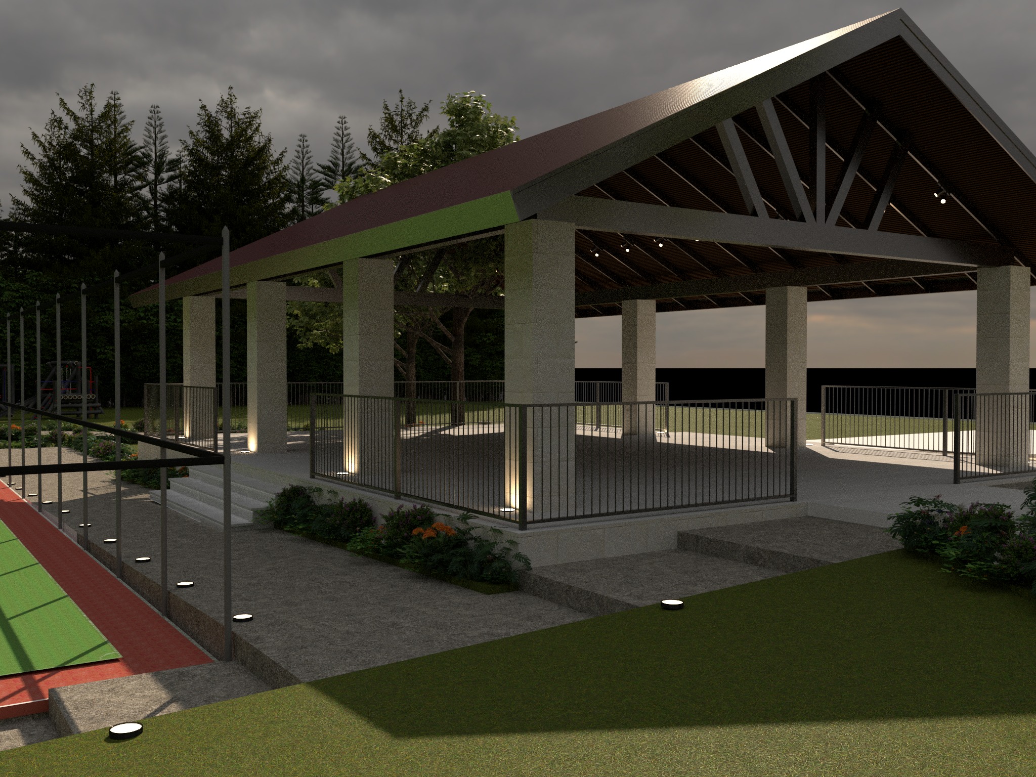 quinta de arquitectura moderna dise o contempor neo exterior atardecer tard o realistic sunset lighting dos palapas modernas de acero con plaf n de lambr n color chocolate recessed spotlights integrados en el plaf n columnas forradas con cantera galarza no agregar iluminaci n arquitect nica adicional aparte de la iluminaci n de andadores estructura de techo de acero color gris oscuro y barandales met licos del mismo tono jardiner a realista con zacate natural iluminaci n sutil en los andadores integrada al paisaje atm sfera elegante c lida y realista clean geometry high material realism professional architectural photography cancha de futbol con red transparente