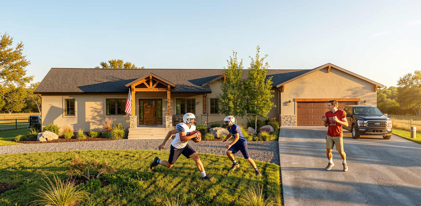 add two boys playing ball ages 6 and 8 brown hair wearing baseball hats in jeans with baseball jersey put boys by truck