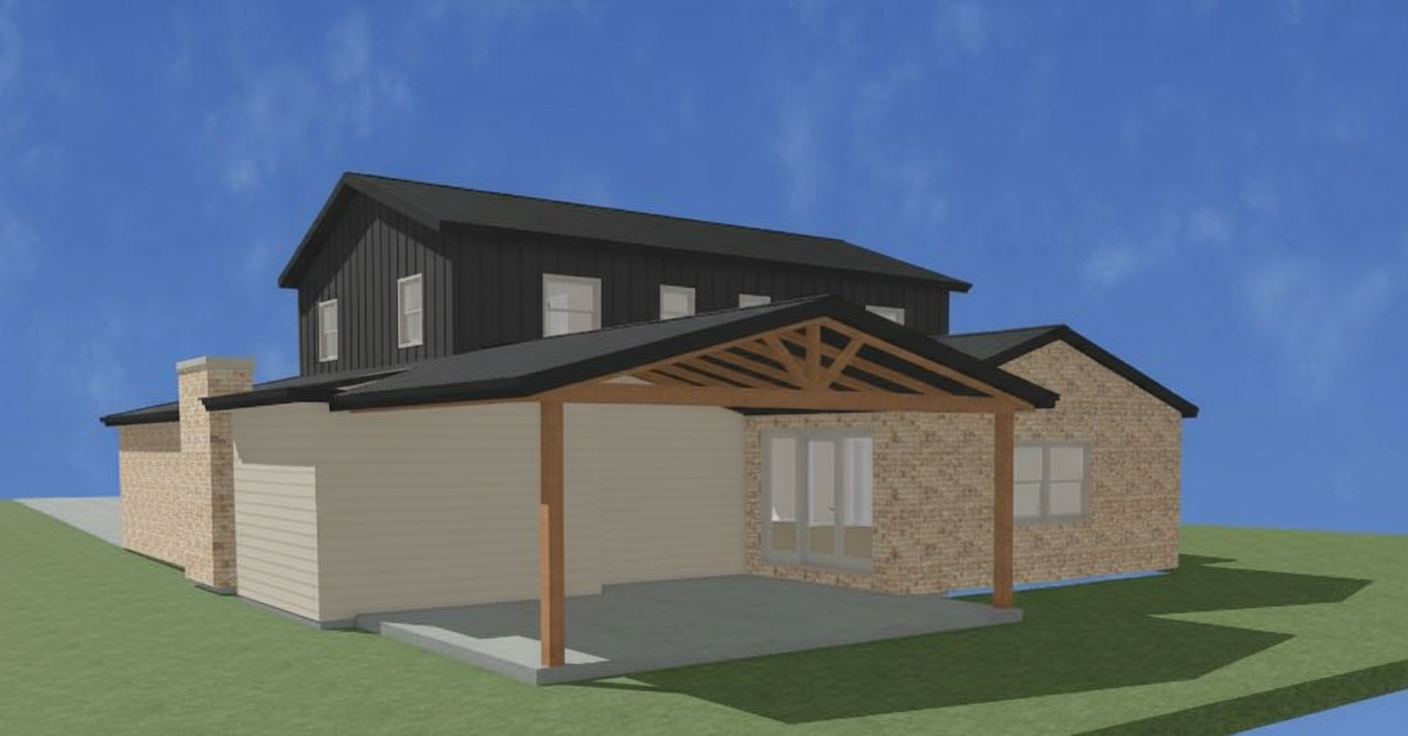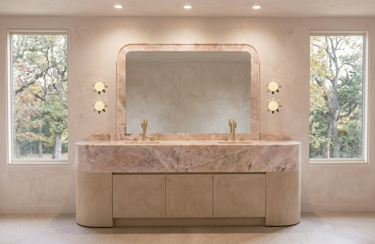 enhance this contemporary kitchen rendering while keeping all architectural volumes cabinetry layout proportions and materials exactly as shown do not modify the design millwork configuration island dimensions hood bulkhead ceiling details or overall composition maintain brutalist stone island keeping stone material scale and color as is matte finish stone should read black with golden veins white cabinetry some doors have heavy molding white cabinetry does not have glass white cabinetry is all solid white wall behind hood has stone material as is scale as is matte highest ceiling is poured concrete toned brass faucet and handles dark painted ceiling with almost black stain color wood plank insert in ceiling above the island medium brown wood flooring lighting upgrades only no design changes add warm vertical integrated led lighting 2700k 3000k inside the glass cabinets the interior of the glass cabinets should be dark almost black stained wood the shelves should be glass and should have some glassware introduce concealed under hood lighting that gently washes the stone backsplash enhance the sculptural pendant so it emits a soft warm diffused glow elegant not harsh introduce subtle ceiling spotlights that graze the stone slab and highlight material texture without flattening it mood atmosphere create a chic warm sophisticated ambiance the space should feel intimate refined and quietly luxurious lighting should emphasize contrast between the deep cabinetry and the luminous marble island the dark wood should read rich and layered not flat black the brass should feel brushed and softly reflective never shiny or brassy the marble should glow gently under warm light revealing its veining overall feeling a high end editorial interior photograph soft and natural moody yet welcoming dramatic but balanced refined warm inspiring avoid changing materials changing finishes changing proportions overexposing highlights cool lighting temperatures adding new decorative elements render as a photorealistic cinematic interior shot with depth soft shadows and natural light falloff