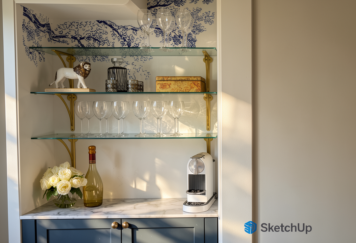 make this interior space photo realistic there is a pool above please make the sunlight shine through the pool and water ripple through the interior space the ripple not go to the ceiling and keep the water in the overhead pool move the pool to the hallway remove the pool from above the kitchen dont show water above the kitchen and make it a white wall for ceiling above kitchen