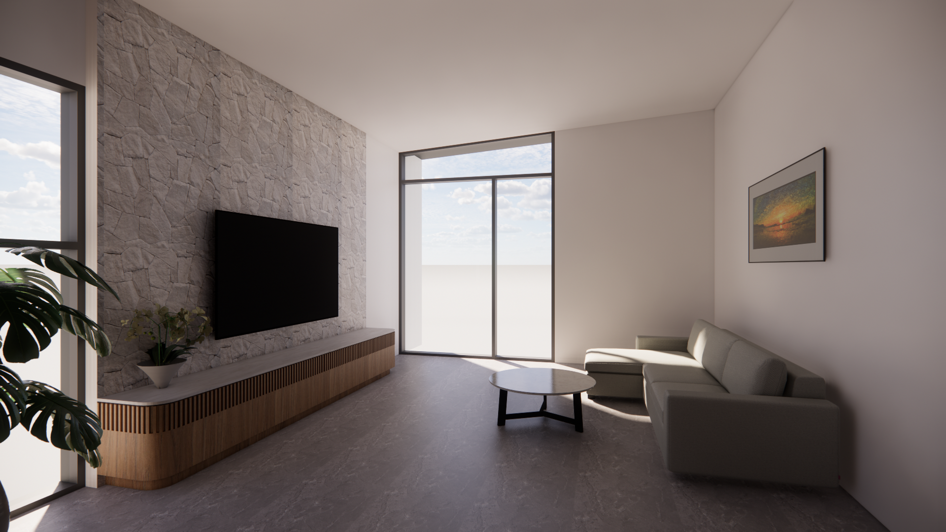 enhance the provided image to ultra photorealistic quality with realistic lighting shadows and depth while strictly preserving all existing colours textures materials finishes wall colours flooring ceiling joinery and architectural elements exactly as they are do not modify recolour replace or adjust any existing finishes populate the space as a comfortable contemporary living area adding only realistic furniture and accessories that blend naturally with the existing palette without introducing new colours or textures add a modern sofa or lounge seating in neutral tones that complement existing finishes a low profile coffee table with simple geometry side table s with subtle detailing soft furnishings such as cushions and a throw that match existing colours exactly a floor or table lamp with warm artificial light a minimal rug only if it does not introduce new colours or textures a small number of realistic decor items books ceramic objects tray one or two indoor plants placed naturally lighting use realistic artificial interior lighting only soft warm ambient lighting with gentle shadow gradients physically accurate reflections and light fall off balanced exposure no hdr or cinematic colour grading rendering style photorealistic interior architectural render true to life material response and scale natural camera perspective with subtle depth of field clean lived in but uncluttered residential feel restrictions critical do not change any colours textures materials finishes or layout do not introduce new finishes patterns or accent colours do not stylise or apply artistic filters no exaggerated lighting no dramatic contrast add cusions to the couch and downlights and warmer image