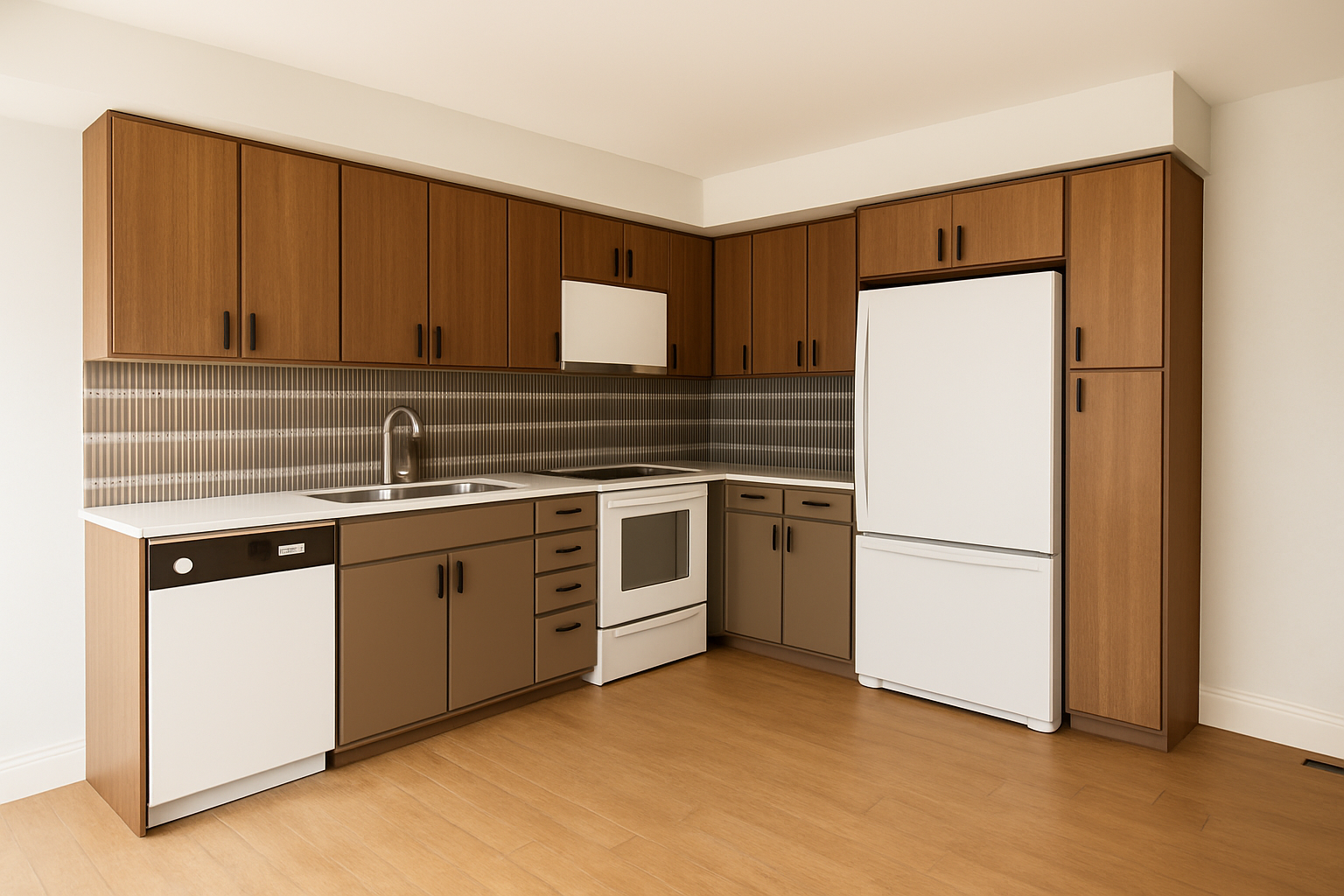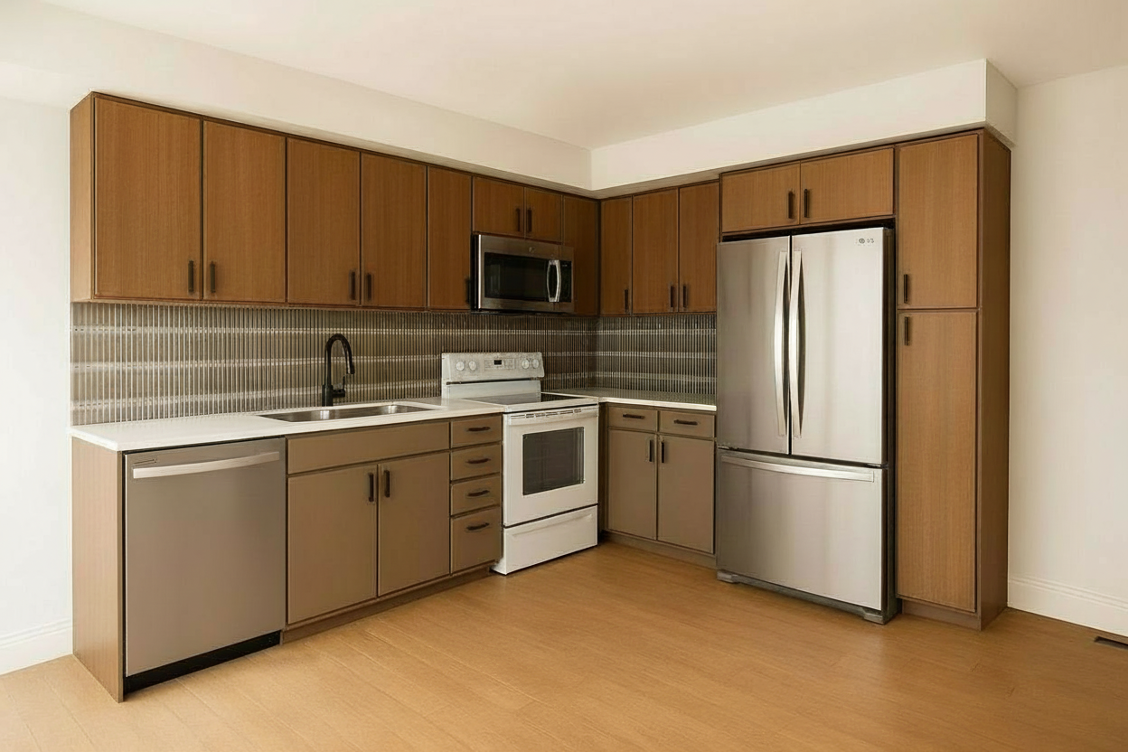 change the range to stainless steel update the upper wood cabinets only to a dark oak leave the lower cabinets as is
