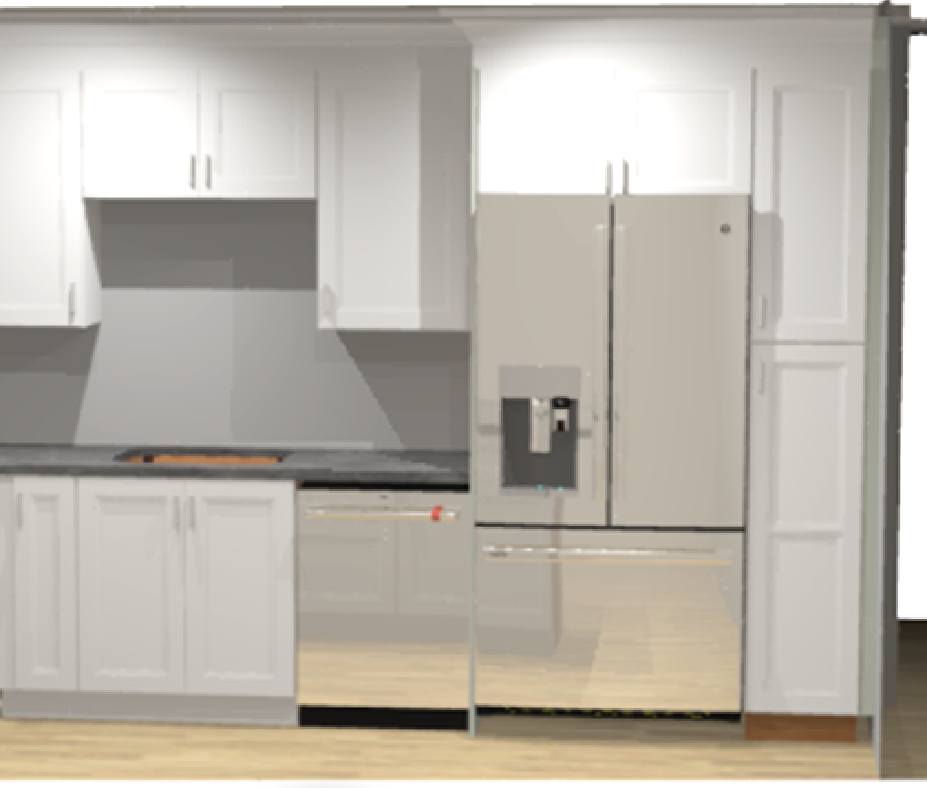 kitchen cabinets should be in a light aqua shade in a shaker door countertops should be a white with light veining stainless steel apploances the feel should be beachy
