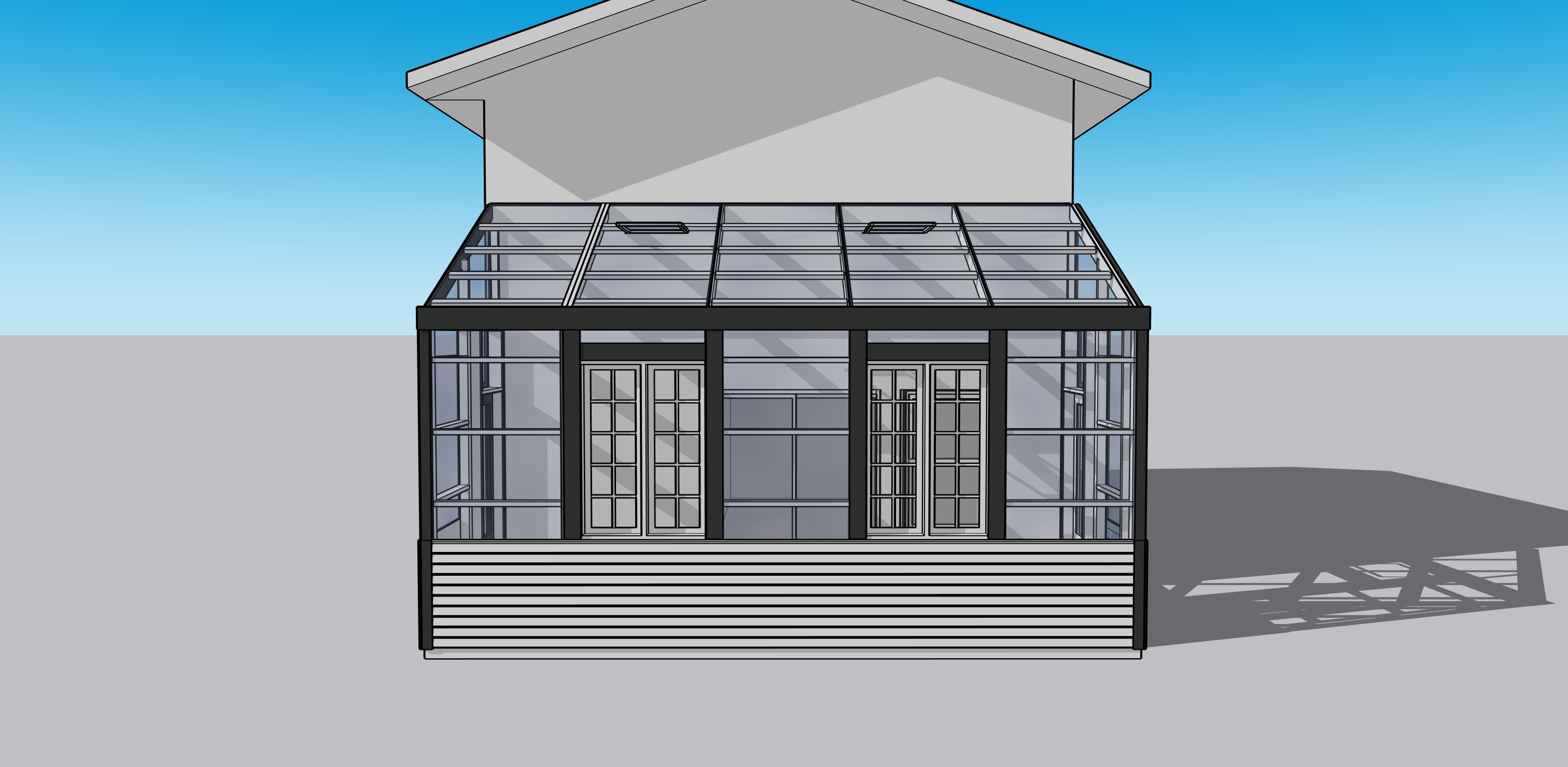 maintain structure enhance the windows on greenhouse add hardie plank siding siding on the main structure add landscape make it look elegant use polycarbonate panels on greenhouse