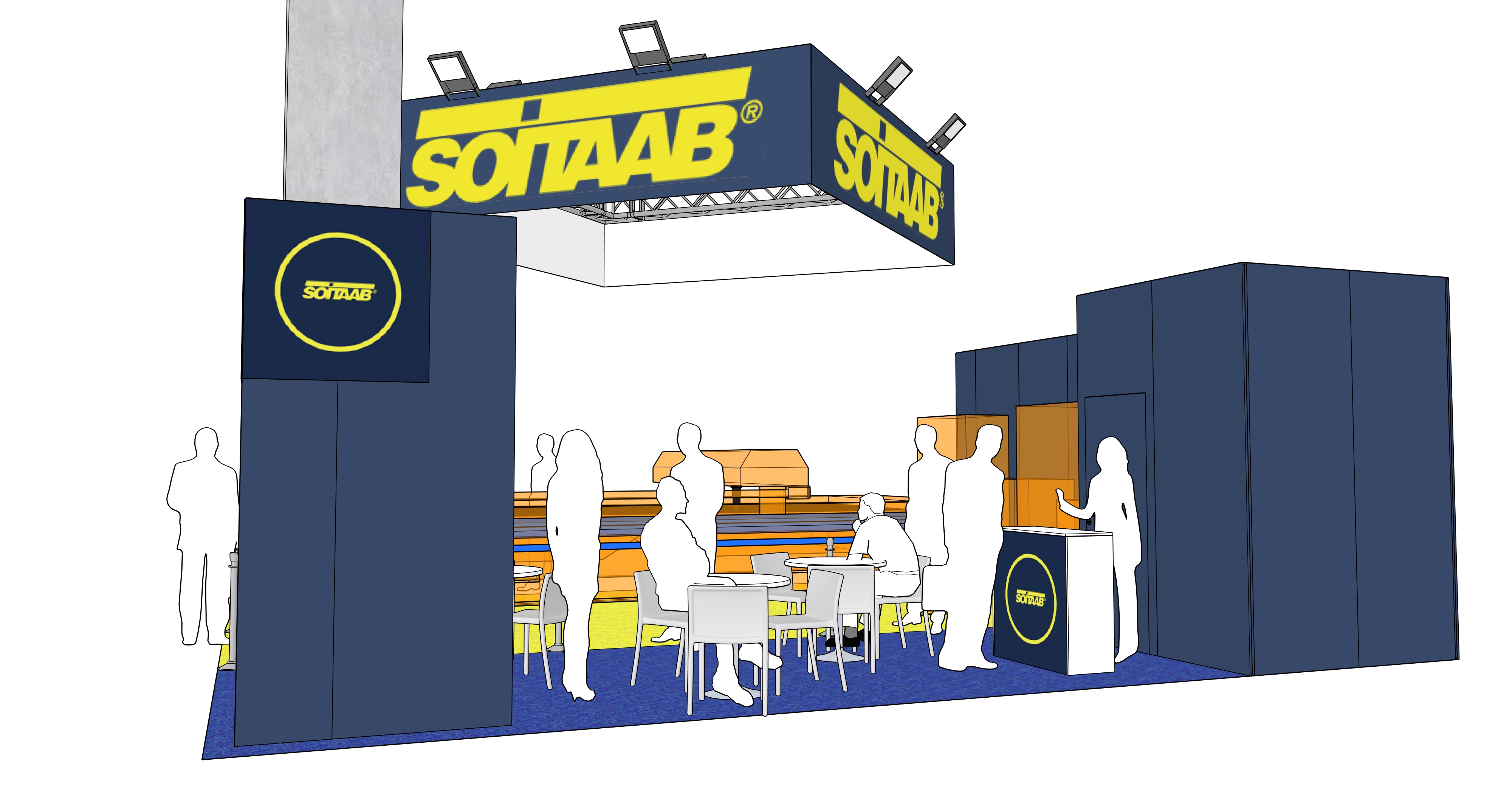 interior shot exhibition booth matte blue wall carpet on the booth floor industrial environment smooth ambient lights on general spotlights in the booth maintain shapes and objects