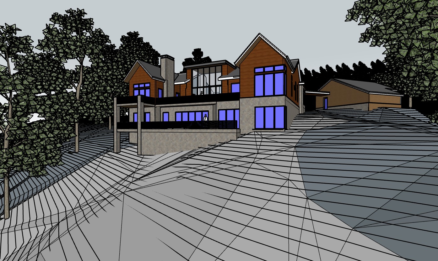 a modern hillside mansion surrounded by lush greenery featuring large bright glass windows reflecting a serene sky small lights under the eaves create small sparkles the exterior walls are a mix of warm wood tones and sleek stone the atmosphere is tranquil and inviting with a soft diffused lights green foliage enhances the natural setting with rich and varied shades