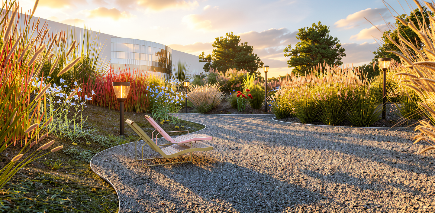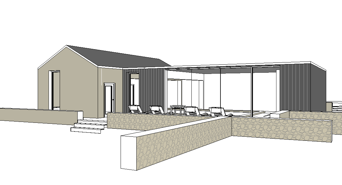 a pool house made from stone and black vertical timber cladding set within a paved garden ultra realistic render