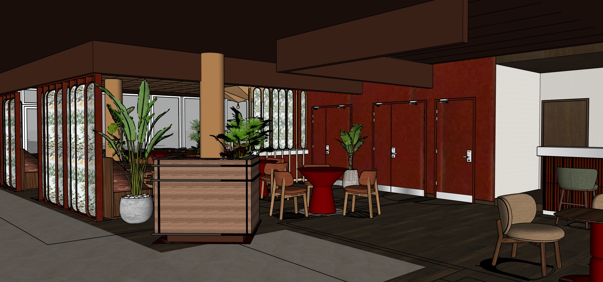 description g n rale modern restaurant interior contemporary horeca design mat riaux et finitions tr s pr cis wooden counter with natural oak finish burgundy wine red panel finishes on lower cabinetry floral patterned curtains white and blue botanical print ajouter d autres mat riaux existants parquet pierre m tal etc d tails de preservation keep all existing materials and color schemes exactly as shown high quality finish details material textures visible professional architectural rendering with detailed surfaces