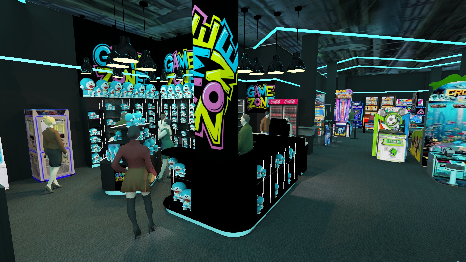 an arcade and gaming hall the machines glow brightly black walls and a black ceiling the floor covered in gray carpet turquoise light lines on the ceiling and turquoise lighting under the furniture create a photorealistic effect
