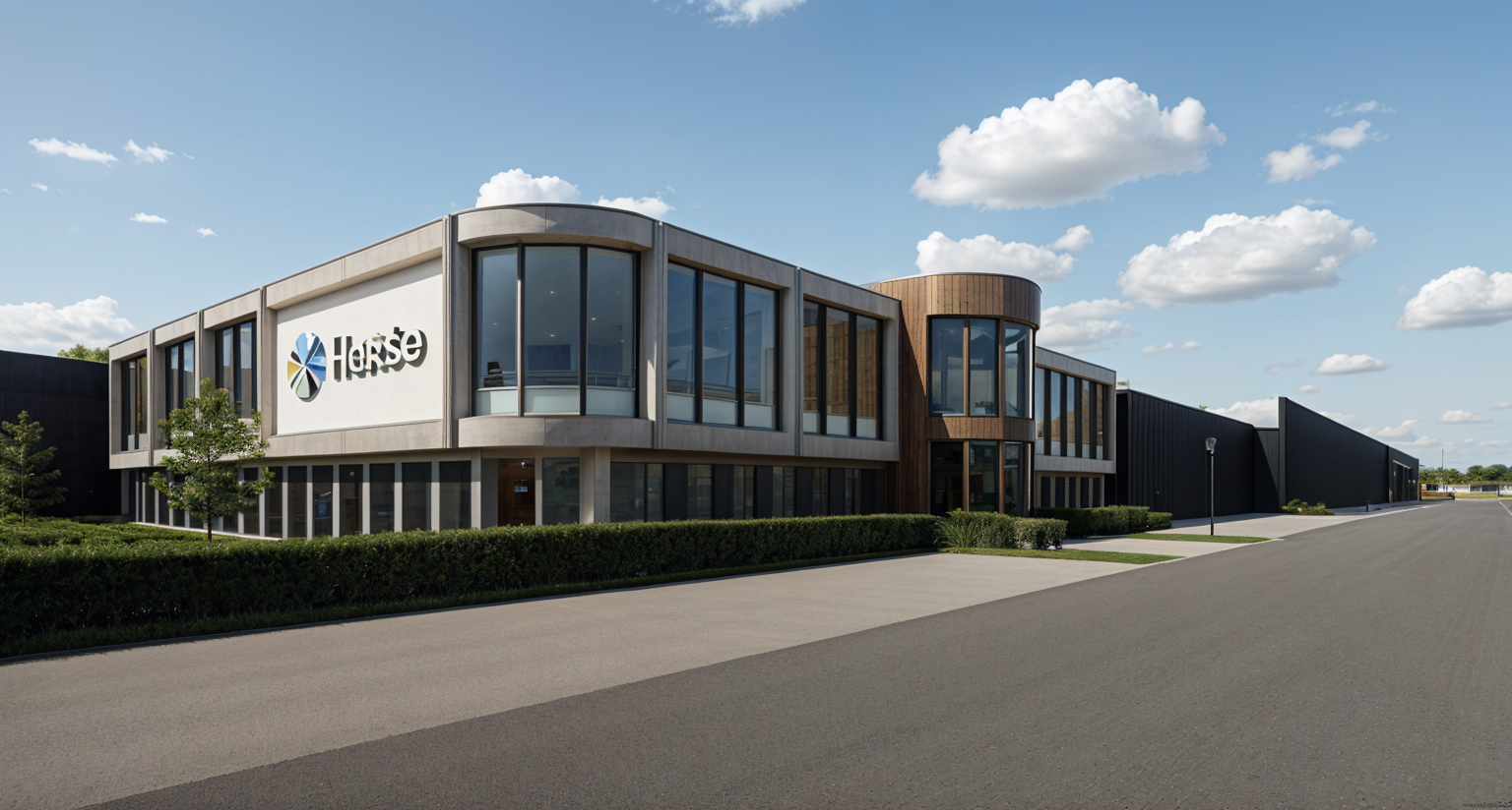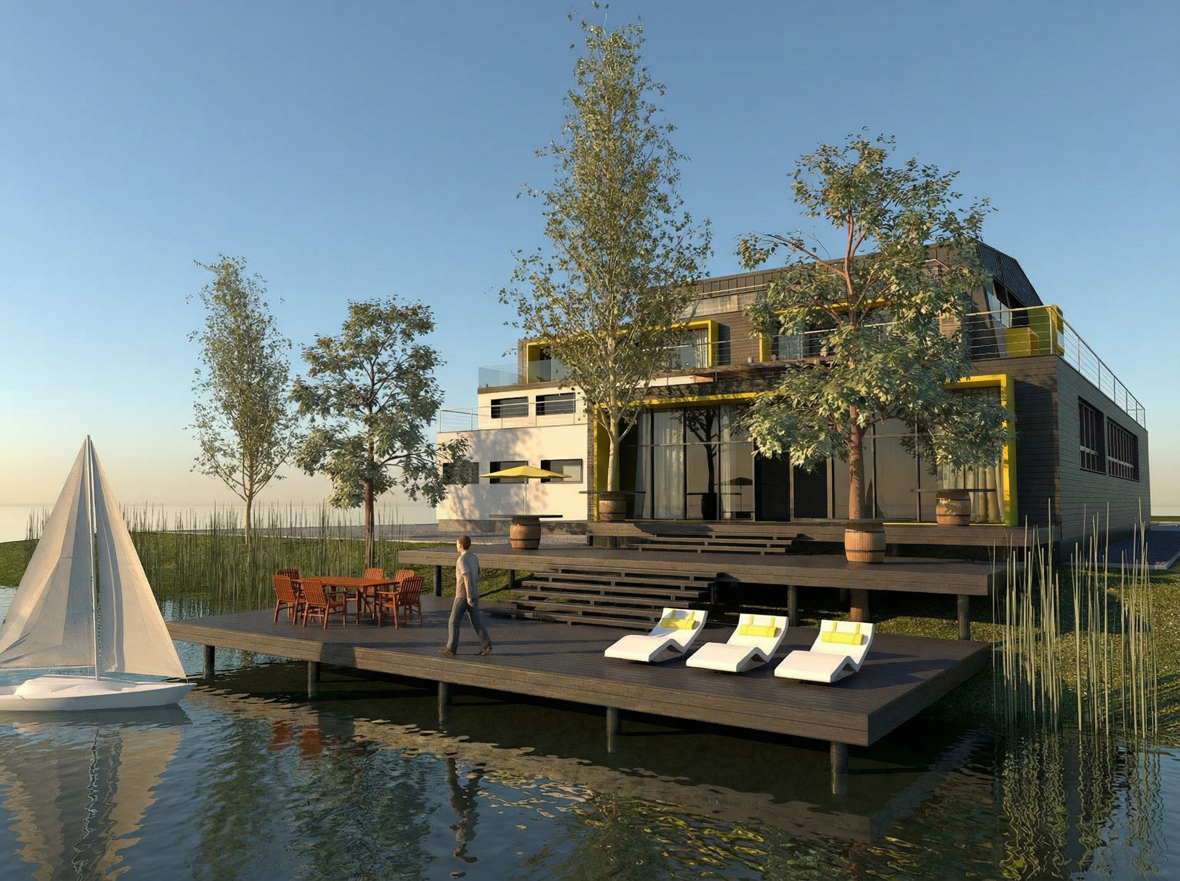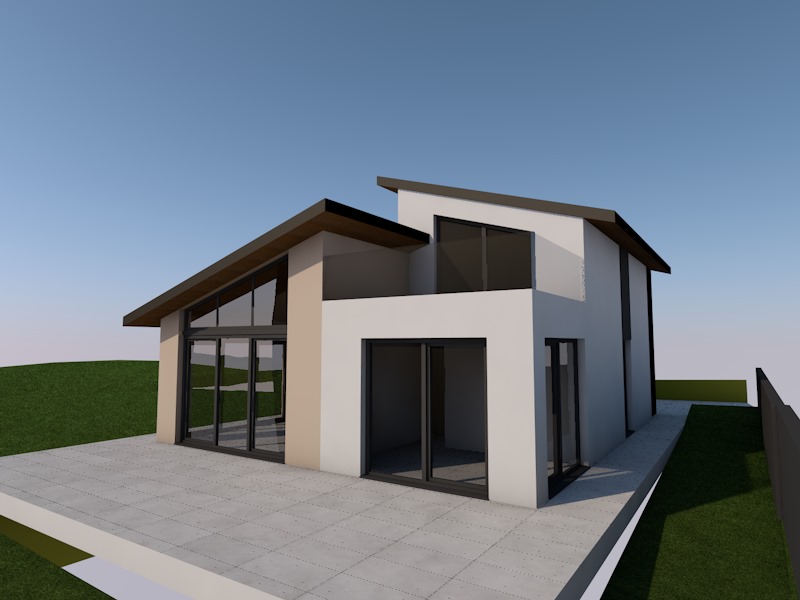 a modern house with large glass windows and minimalist design set on a spacious stone patio the walls are a soft cream color and the roofs are a rich dark brown the sky is a clear gradient blue transitioning to a subtle pink at the horizon evoking a serene sunset atmosphere the surrounding grass is lush and vibrant green enhancing the fresh and tranquil setting