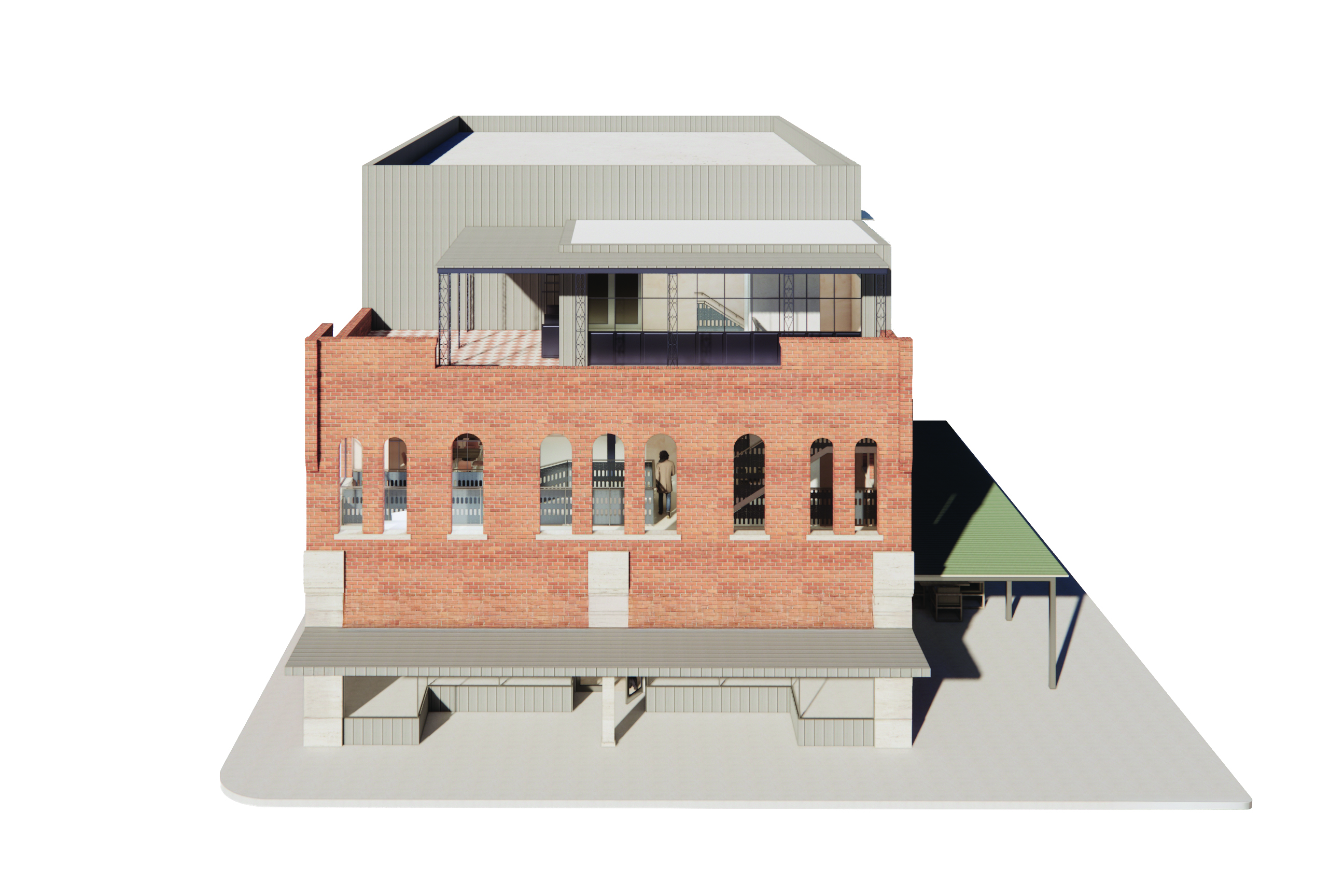 historic building in waco texas with a proposed courtyard to the right where the awning is market set up and parking lot situated behind and to the right minor street located in front of and to the left of the building yellow street lamps line the sidewalk incorperate numerous architectural shading devices because the street is very hot with minimal shading add bushes grass and trees mainly to the right of the building in the courtyard field