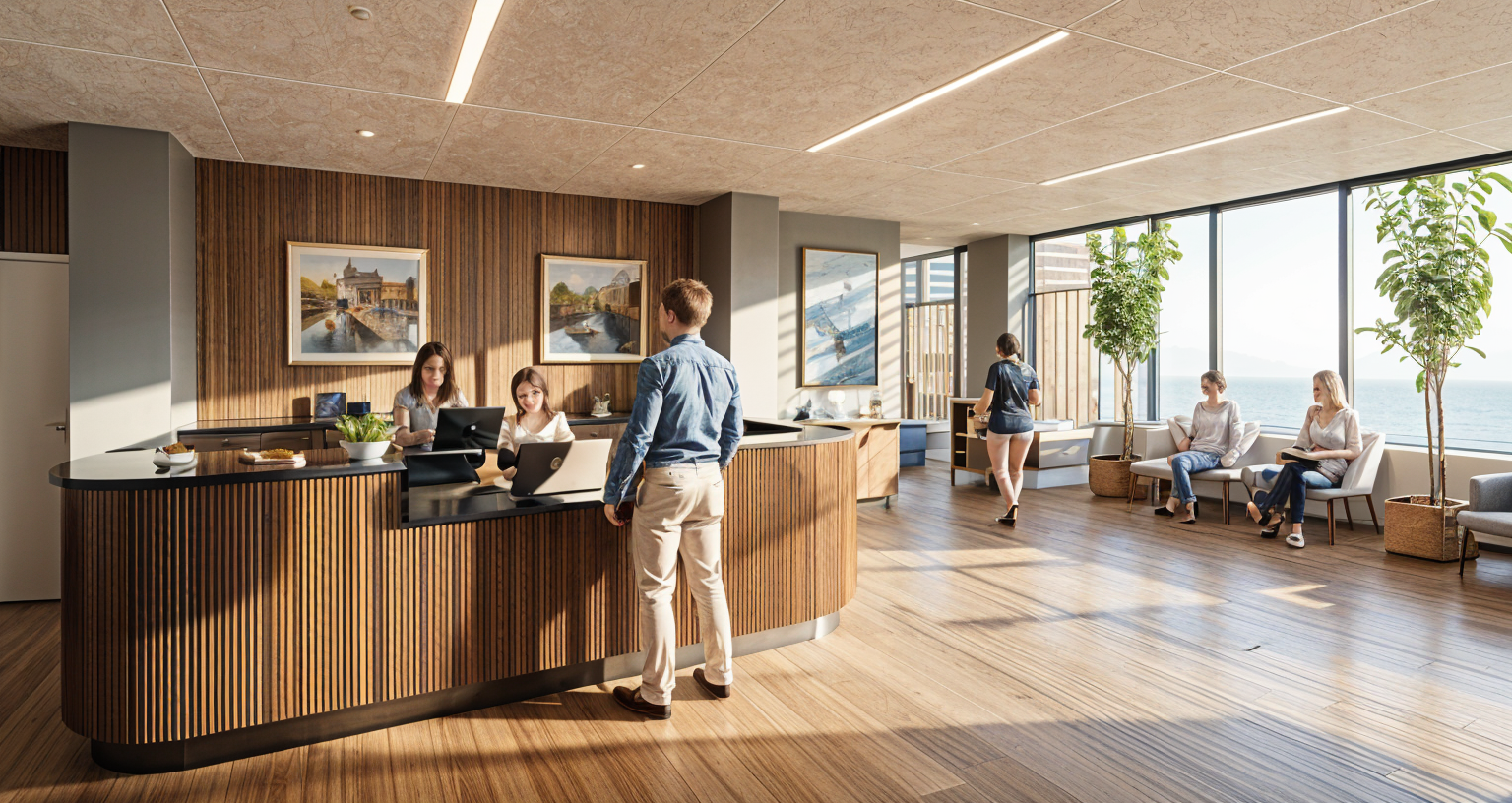 photorealistic interior lobby at senior living facility show old people sitting and walking through space wood wall paneling feature wall behind front desk with artwork mounted to wall scene outside window to be of the beach far off in the distance