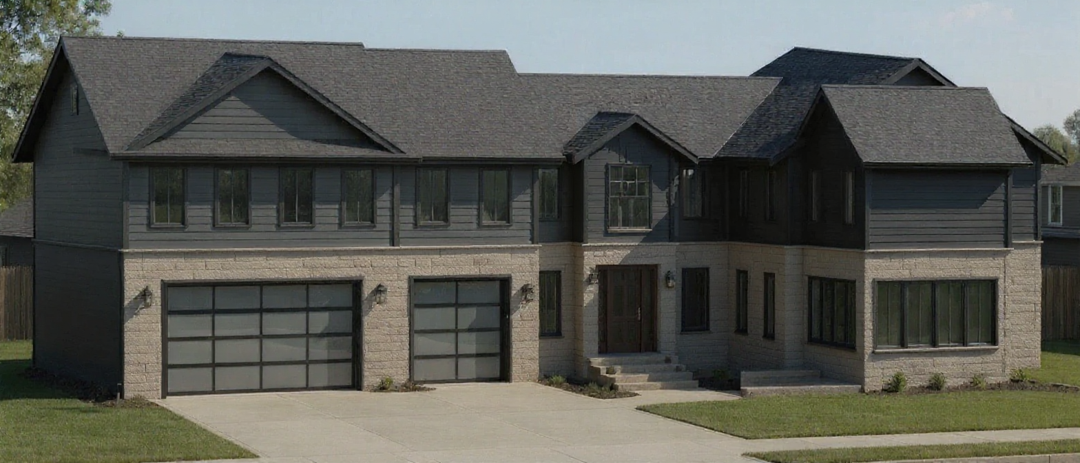 change garage doors to dark walnut with curved glass at upper panel change all windows to have cottage style grills