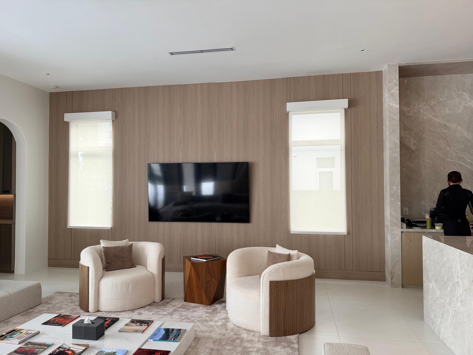 en esa pared eliminar las ventanas y crear una propuestas de una mueble de pared en toda el area donde incluya un tv de 85 aproximadamente en el centro y alrededor haya espacio para elementos decorativos guardar cosas en los espacios donde se vea la profundidad tipo repisas puede tener luces led tenua los materiales pueden ser como el existen en la pared o colores neutros en la misma paleta de colores