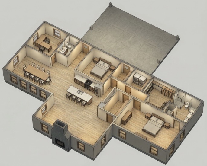 12 foot ceilings in all rooms 20 foot cathedral ceiling in living room white metal siding on the exterior black metal roof