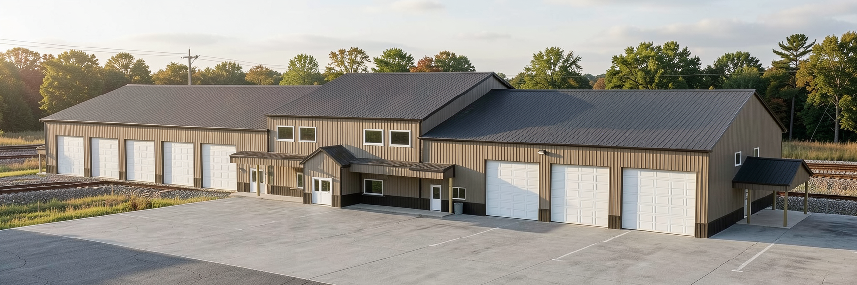 can you make this look more realistic as if it were taken from a camera add a set of railroad tracks behind the building also add some rural trees in the background