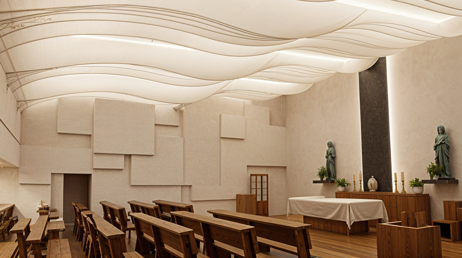techo con telas organicas traslucidas ambientacion calida iglesia catolica modulos y muros blancos texturas de buen acalidas mobiliario de madera estatuas blacas
