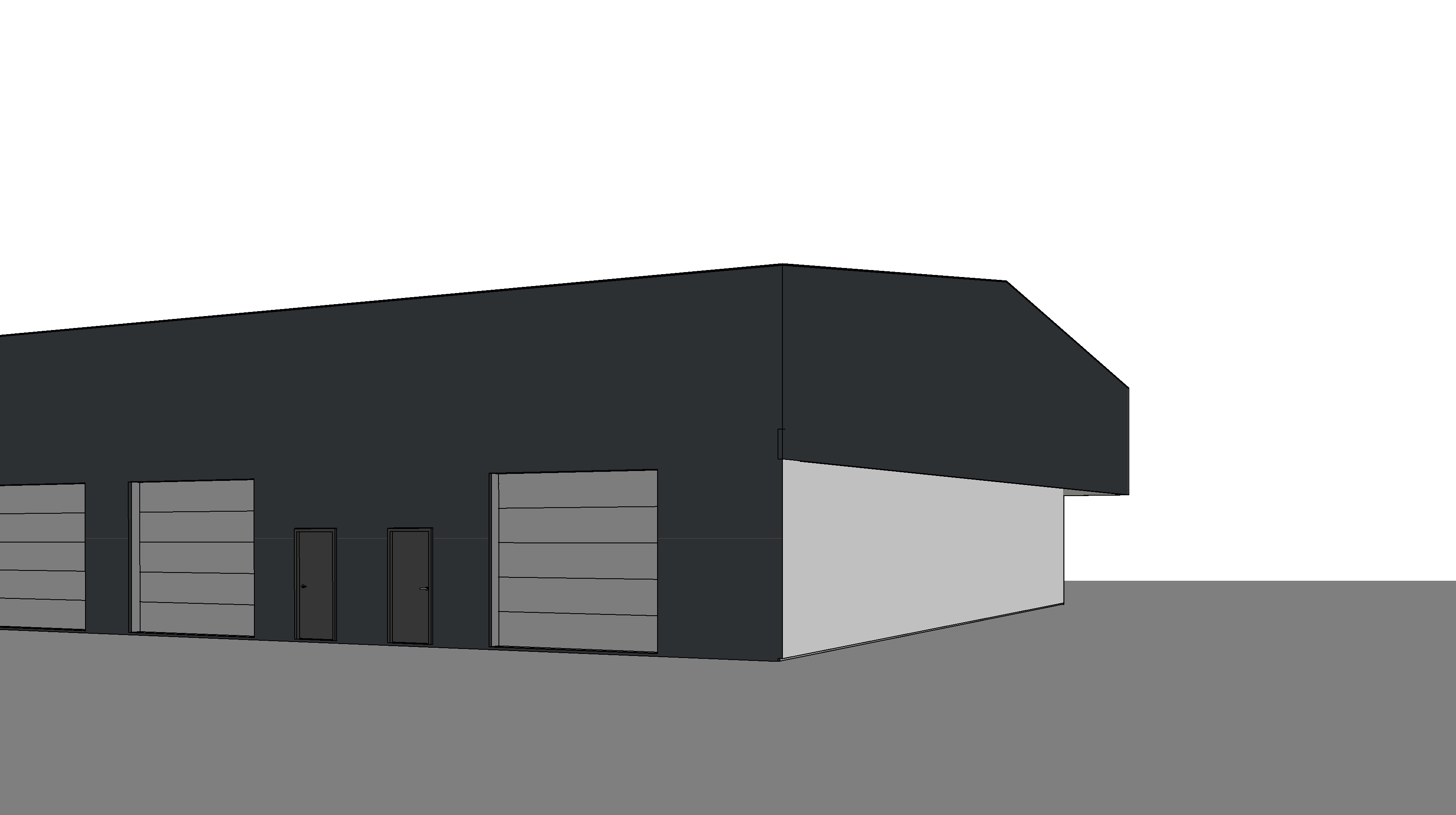 a modern industrial building with a smooth matte facade in deep near black ral 7021 anthracite grey maintain the exact building massing roofline window and door placement and proportions exactly as shown in the reference image emphasize the clean monolithic industrial expression where the facade steps inward on the diagonal surfaces apply raw cast in place concrete with subtle formwork texture and realistic edge definition create a clear material contrast between the dark metal facade and the exposed concrete recesses surround the building with a clean asphalt site surface extending naturally from the structure include a continuous 1 meter wide light concrete pedestrian walkway wrapping around the entire building perimeter with crisp edges and realistic joints use soft overcast northern european daylight for realistic industrial mood create physically accurate materials subtle roughness variation sharp but natural shadows and high detail in the facade panels concrete texture asphalt grain and glazing reflections camera at eye level three quarter architectural view slight wide lens professional architectural photography composition ultra realistic rendering high dynamic range global illumination and atmospheric depth render in hyper realistic architectural visualization quality 8k resolution