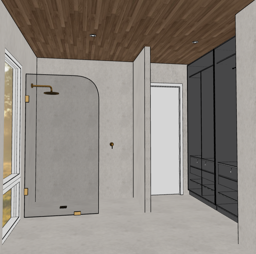 certainly here s a prompt for you render a modern bathroom interior with a focus on minimalism and elegance the shower area features sleek transparent glass with brushed brass fixtures the walls and floor are adorned with soft pale gray concrete textures creating a seamless and polished look the ceiling is composed of rich dark oak wood panels adding warmth and contrast a large window permits soft natural light to filter through creating a serene and inviting atmosphere on one side there s a sleek matte black wardrobe with subtle metallic accents for a sophisticated flair ensure the scene conveys tranquility and modern luxury