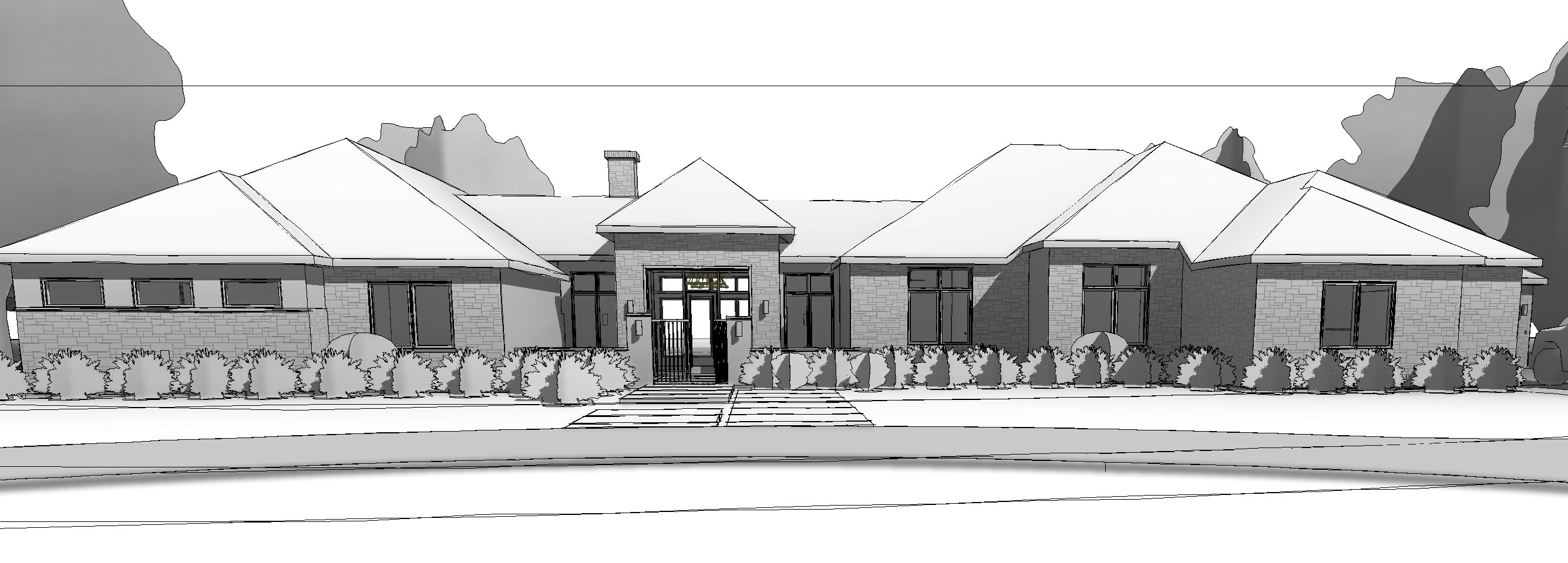 mid century modern transtional texas hill country vide large limestone walls with buff stucco bronze windows darker tile roof courtyard near entry landscape with texas natives losts of trees overcasted day and wet driveway