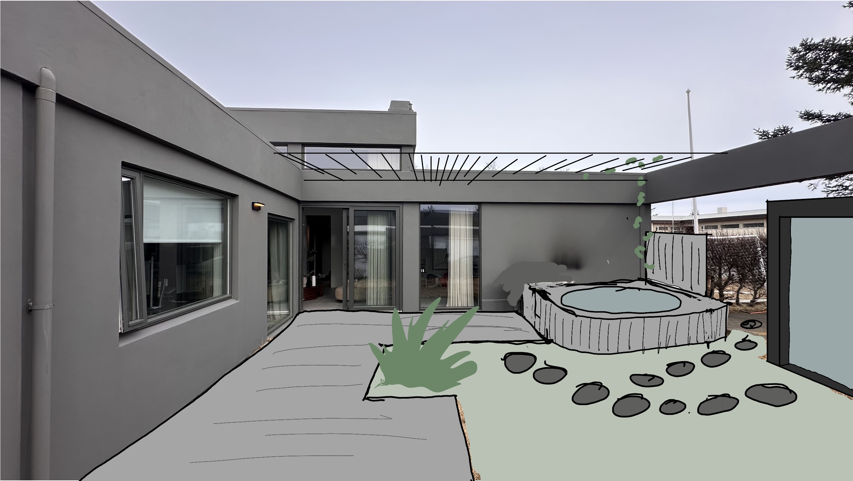 redesign a modern icelandic backyard patio connected to a flat roof gray house with large glass openings create a warm inviting outdoor living space suitable for cold climates include a combination of large format stone paving built in wooden seating and a partially covered pergola or roof extension add a sunken hot tub or spa area with natural stone cladding integrate soft landscape elements such as ornamental grasses and low maintenance planting beds consider wind protection lighting and year round usability the design should feel minimal nordic and high end with a balance between hardscape and greenery